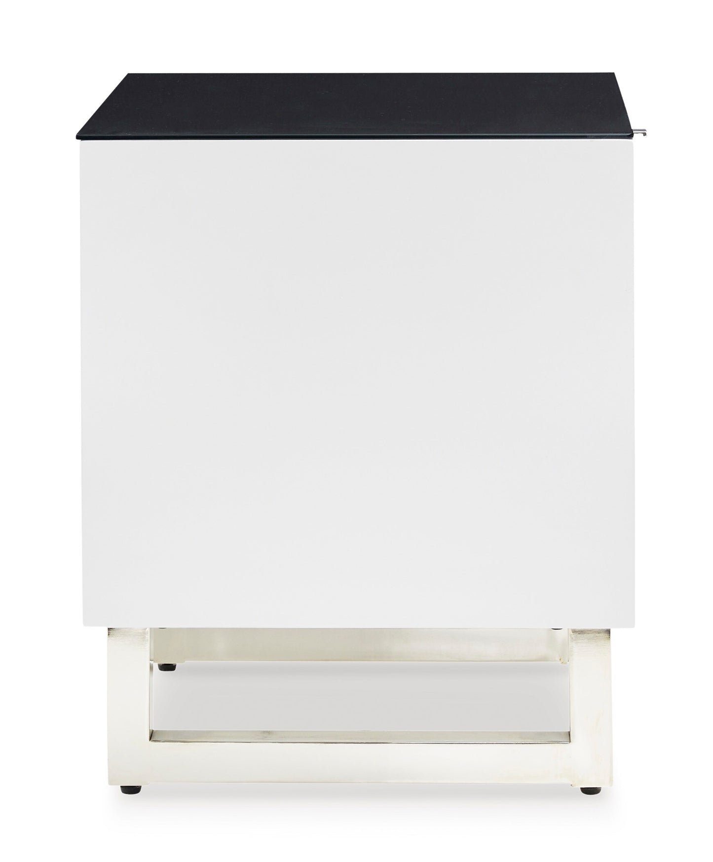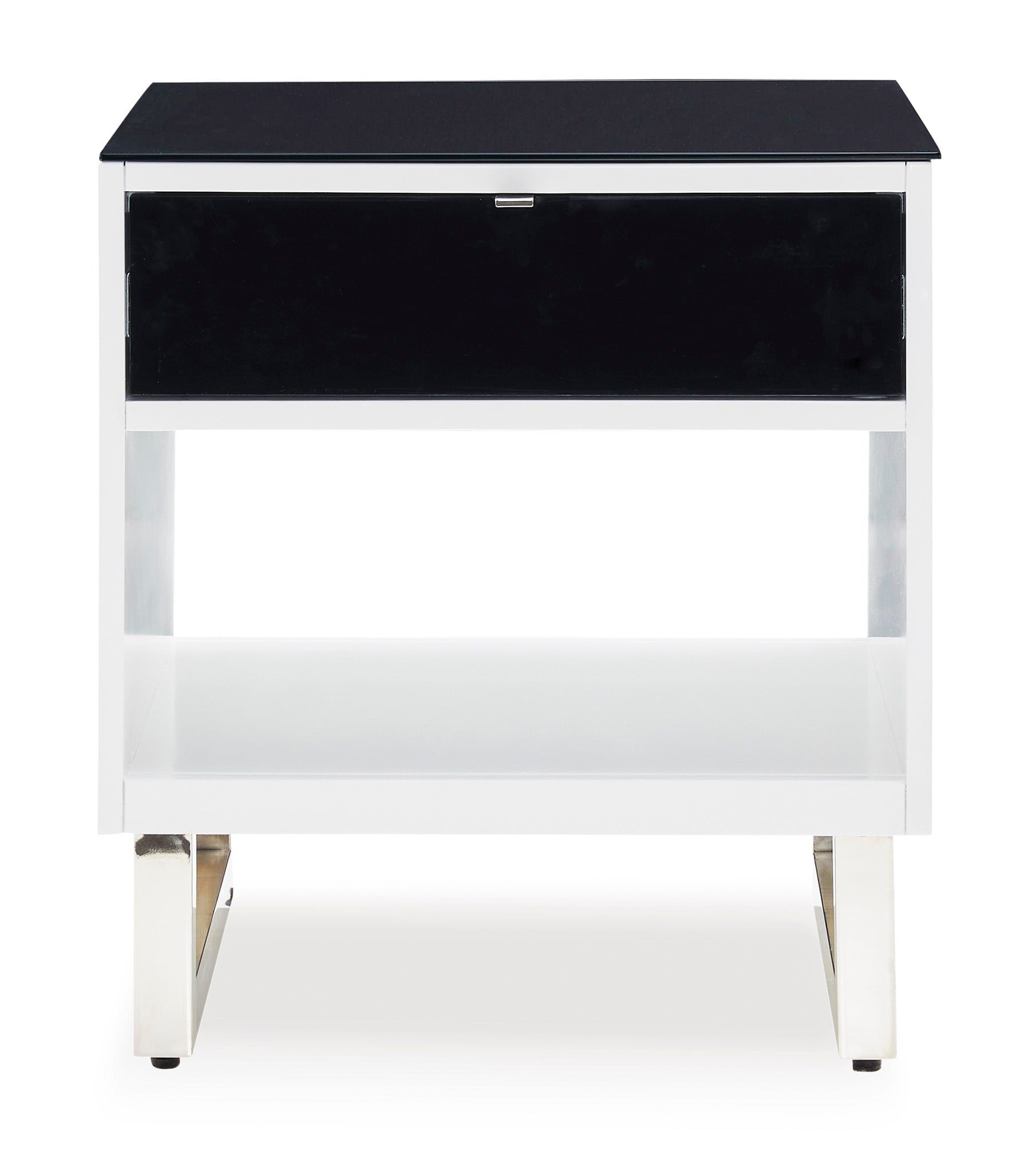 Combining a high-gloss white finish with a black glass tabletop, the Gardoni end table proves opposites really do attract. It's the perfect blend of modern style and functionality, with a spacious drawer and open cubby for keeping media needs close at hand. What a smart choice on so many levels.