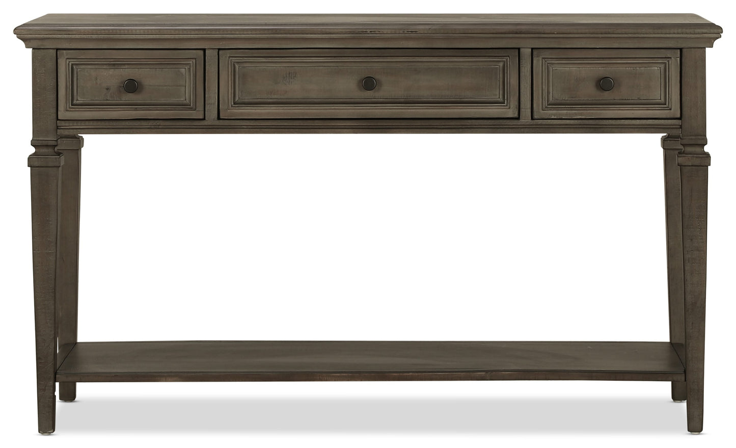 Shabby chic with a hint of down-home country. The Garrett sofa table with a textured dovetail grey finish is all the talk of today’s design world. Smooth-gliding drawers make it easy for you to store away your belongings in style, while a display shelf raises the aesthetic and offers even more storage space.