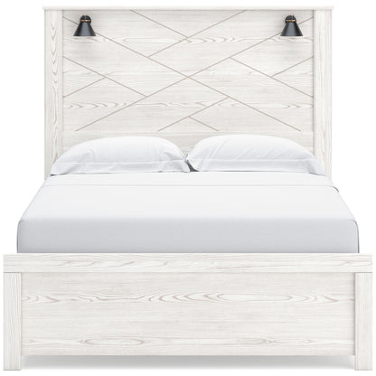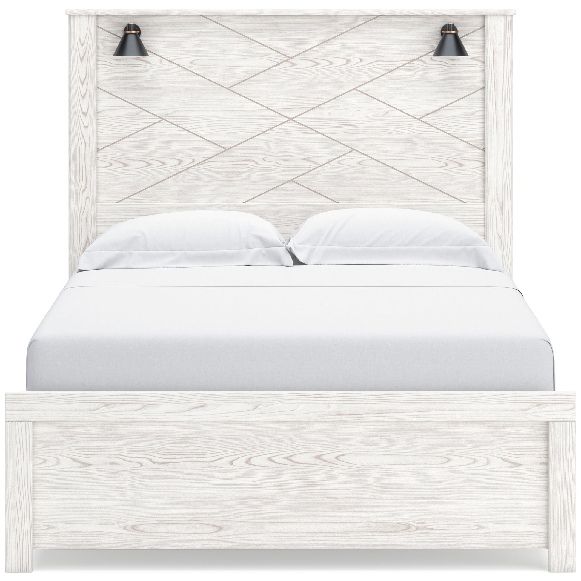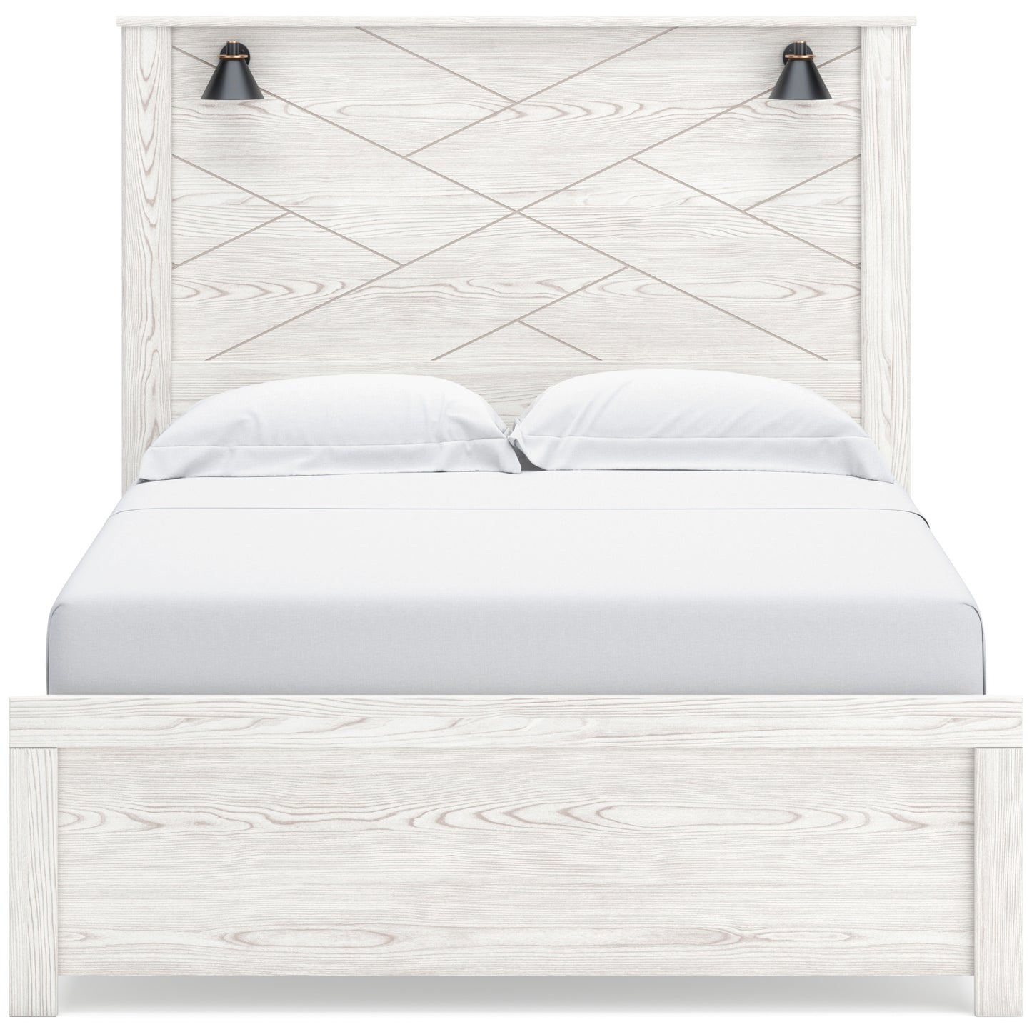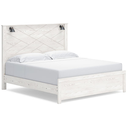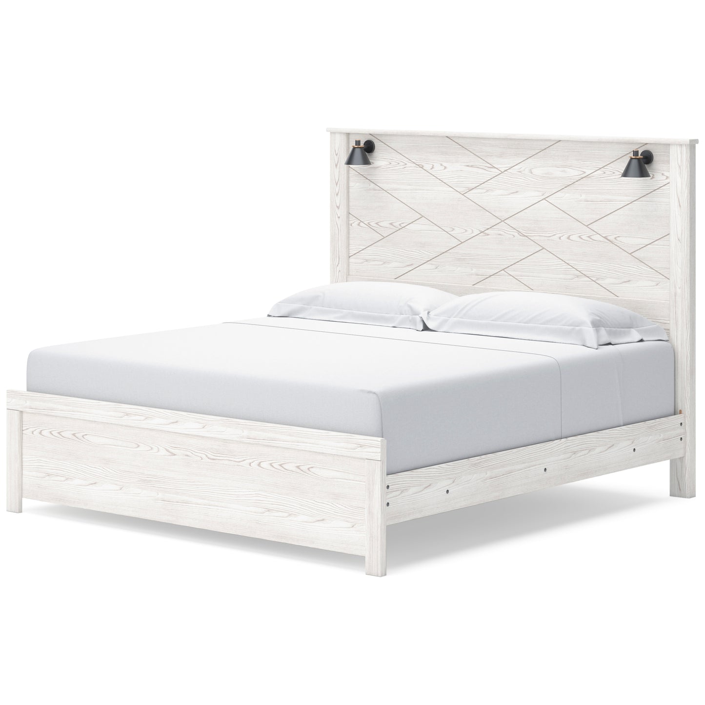 Cool, clean and casually modern. This panel bed’s white rustic finish sets the tone for your calming sanctuary. Matte black sconce lights and an abstract design on the headboard bring a fresh look to the bed’s simply stunning profile.