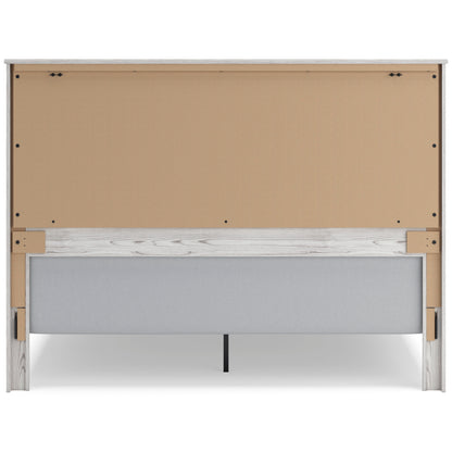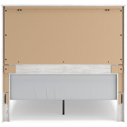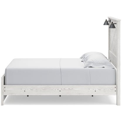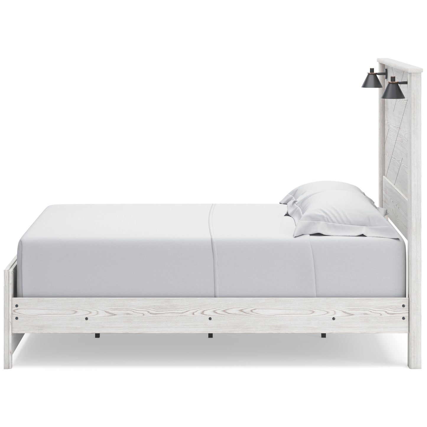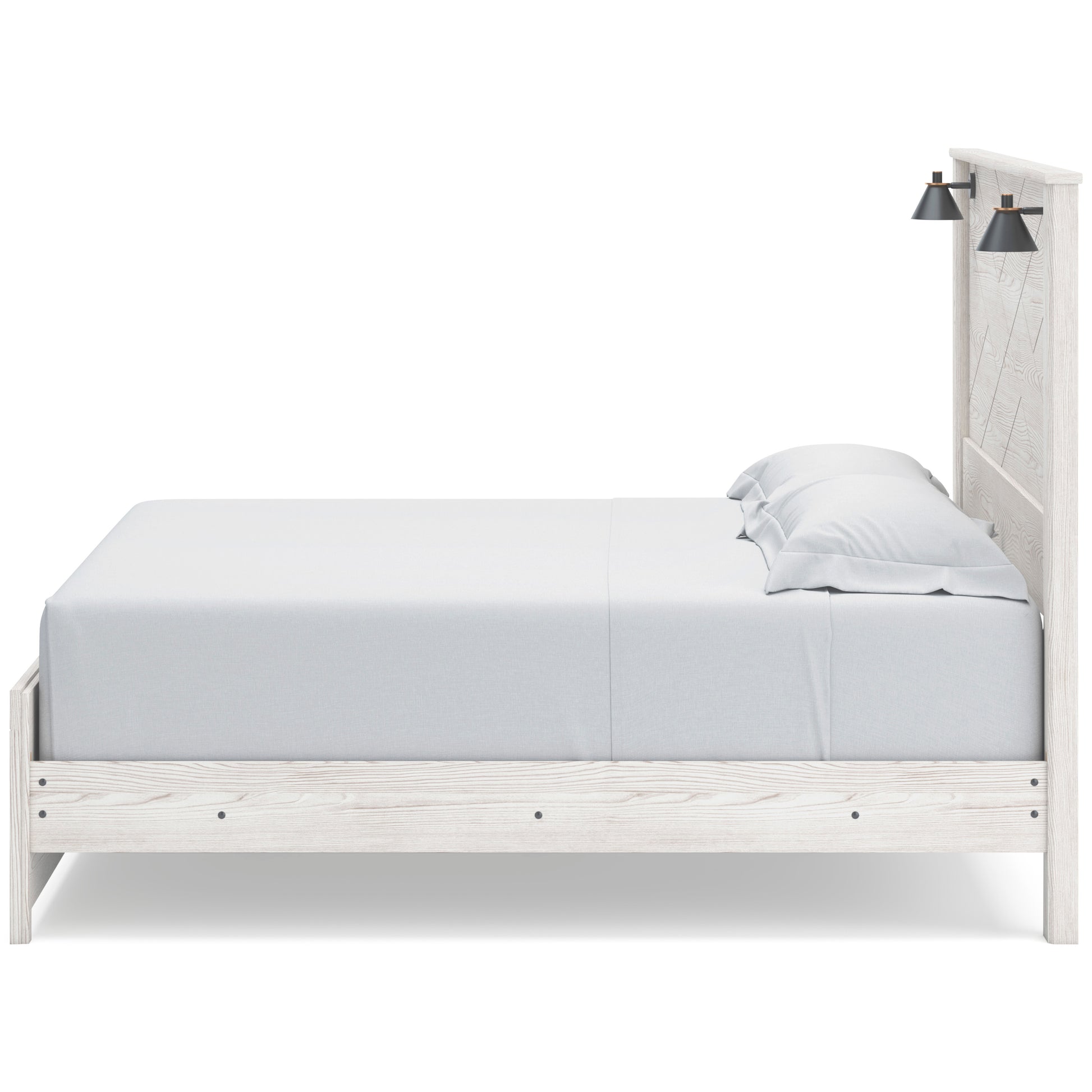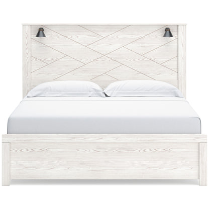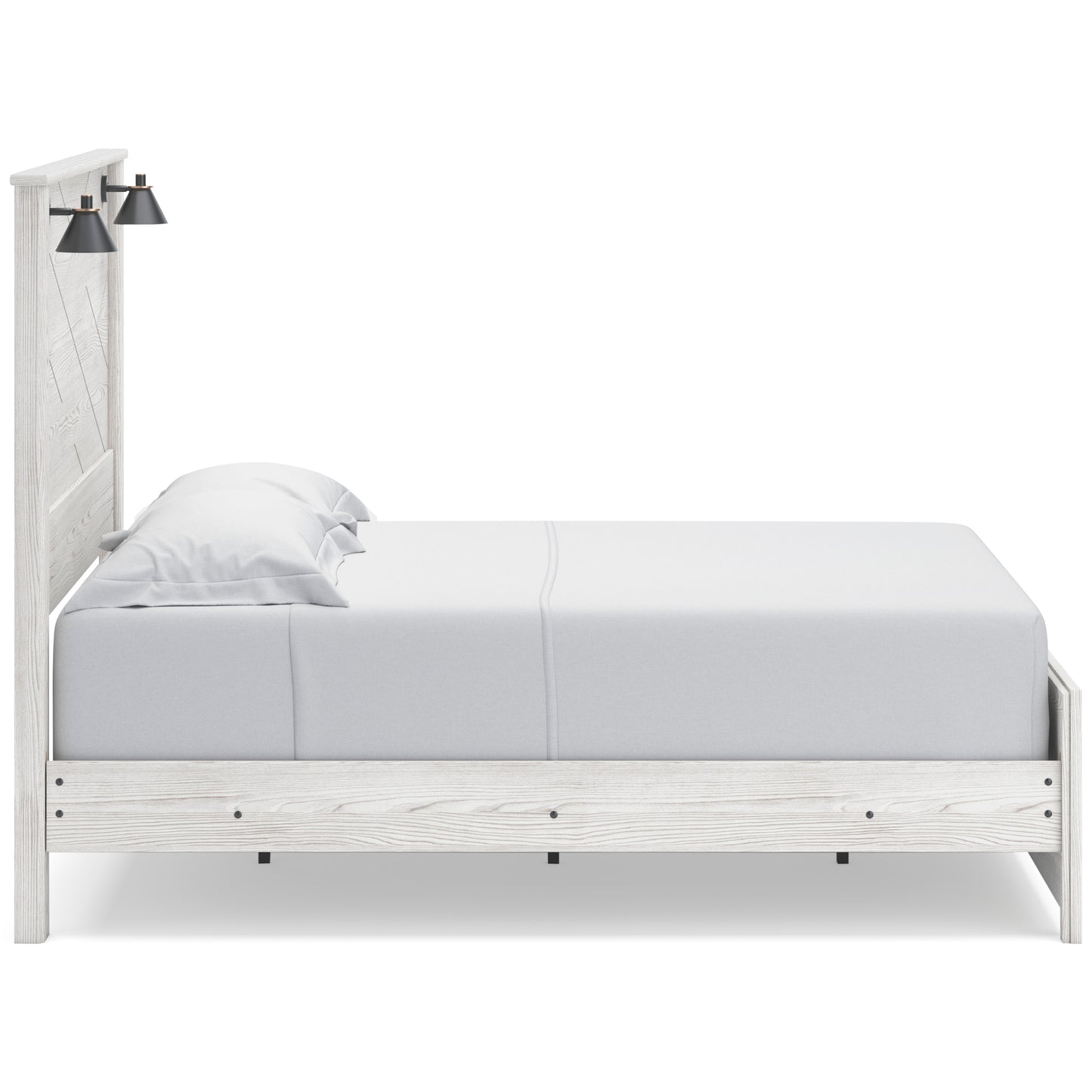 Cool, clean and casually modern. This panel bed’s white rustic finish sets the tone for your calming sanctuary. Matte black sconce lights and an abstract design on the headboard bring a fresh look to the bed’s simply stunning profile.