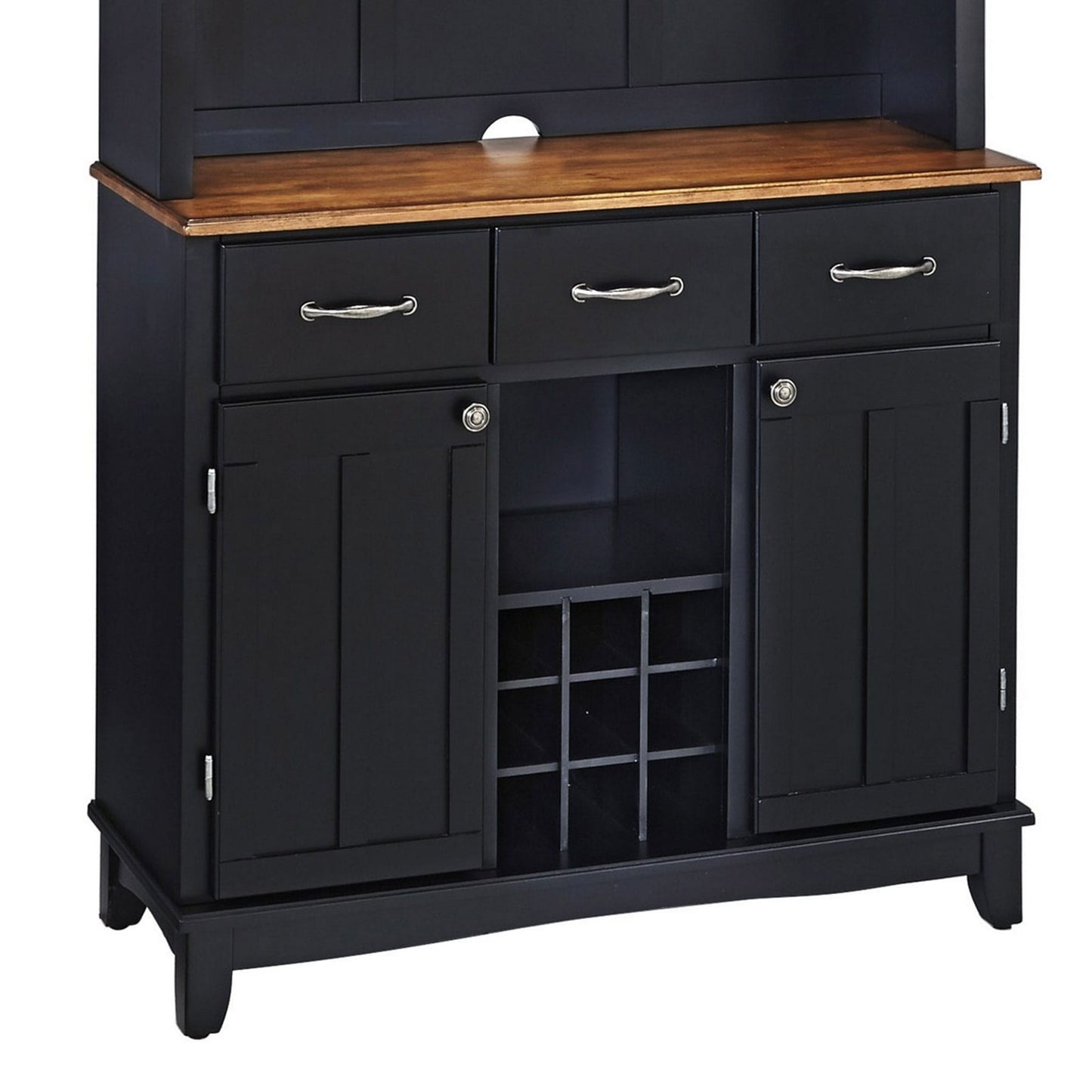 The Hampton Server with Hutch by homestyles is designed to offer flexible storage and display for your kitchen or dining room. Server and hutch feature a black finish and cottage oak wood top with brushed steel hardware. Unit has expansive storage, with three utility drawers on metal drawer slides and two cabinets, each with an adjustable shelf, plus a center open storage area. The buffet features a nine-bottle wine storage bin that can be removed for open storage. The hutch features two wood-framed doors with plexiglass and an adjustable shelf inside for plenty of storage.