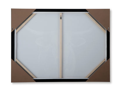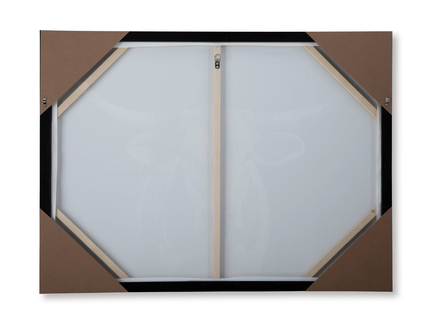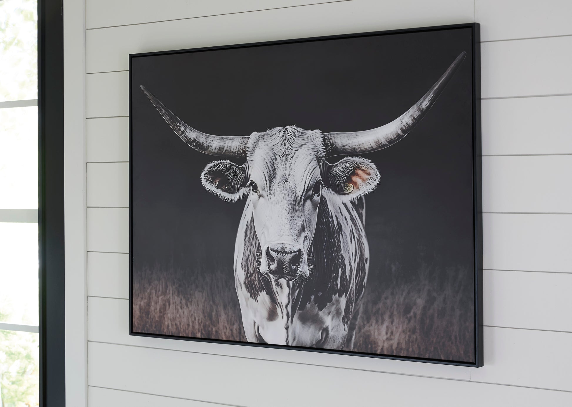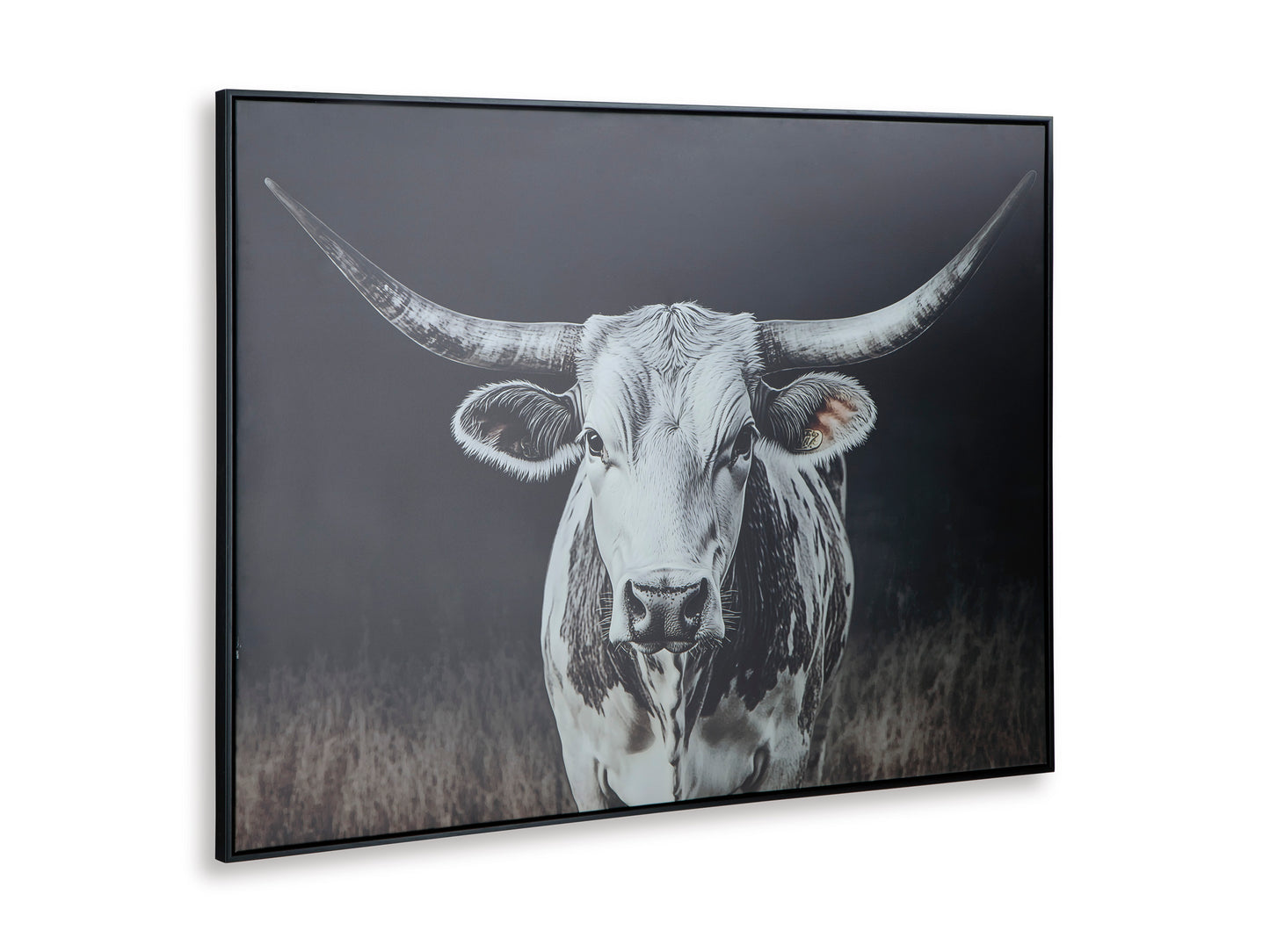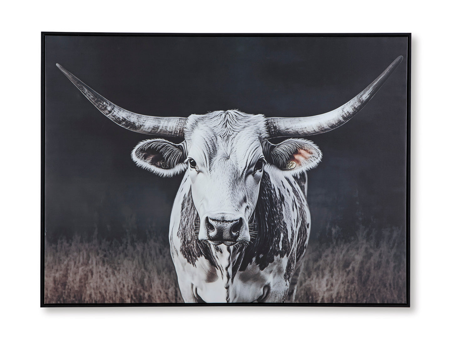 Add homespun charm to modern farmhouse and casual spaces. A longhorn cow takes center stage in this wall art, its white coat contrasting beautifully against the dark background tones. A sleek black frame completes the look.