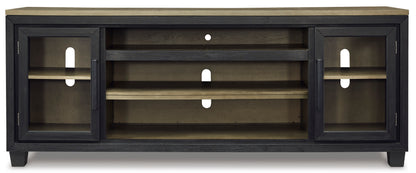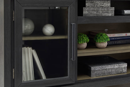 The Foyland TV stand with fireplace option is rustic, casual contemporary style simply done right. Its two-tone color scheme features a rich brushed black finish accented with a dusty grayish brown wood tone. With two glass-front cabinets (each with an adjustable shelf), an open cubby and a removable center shelf, it offers plenty of storage to house all of your electronic needs. Compatible with W100-12 electric LED fireplace insert (sold separately).