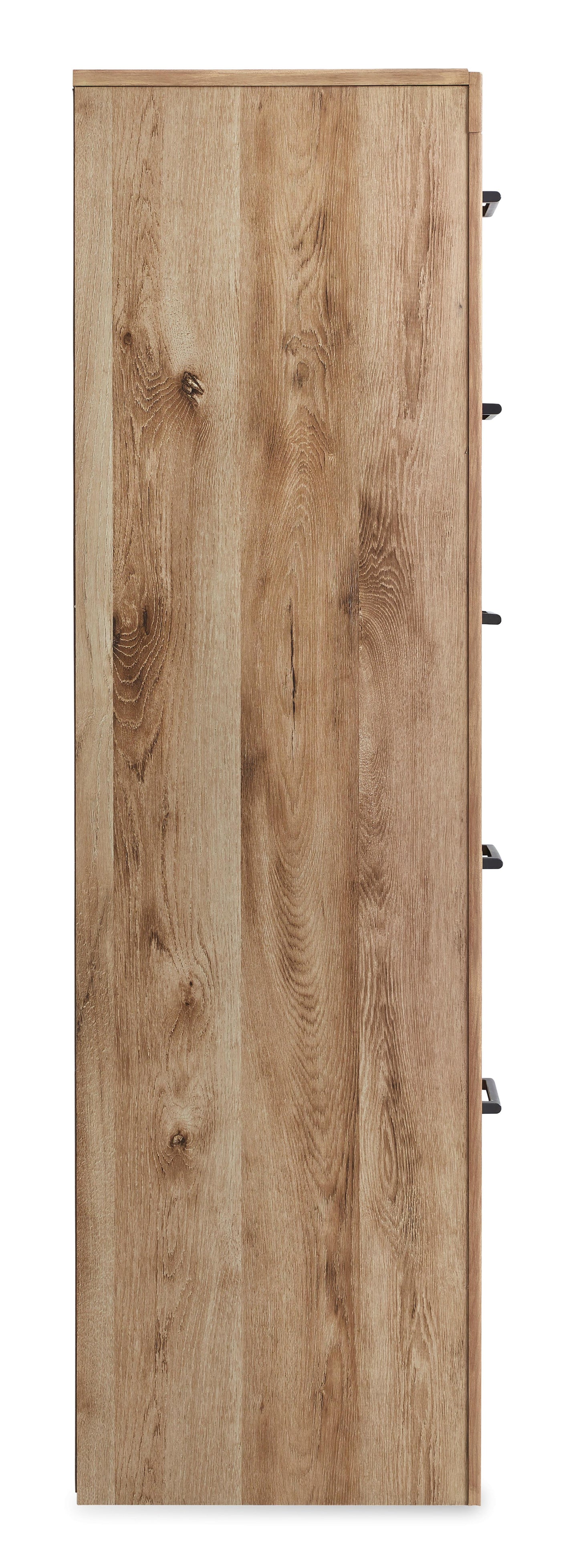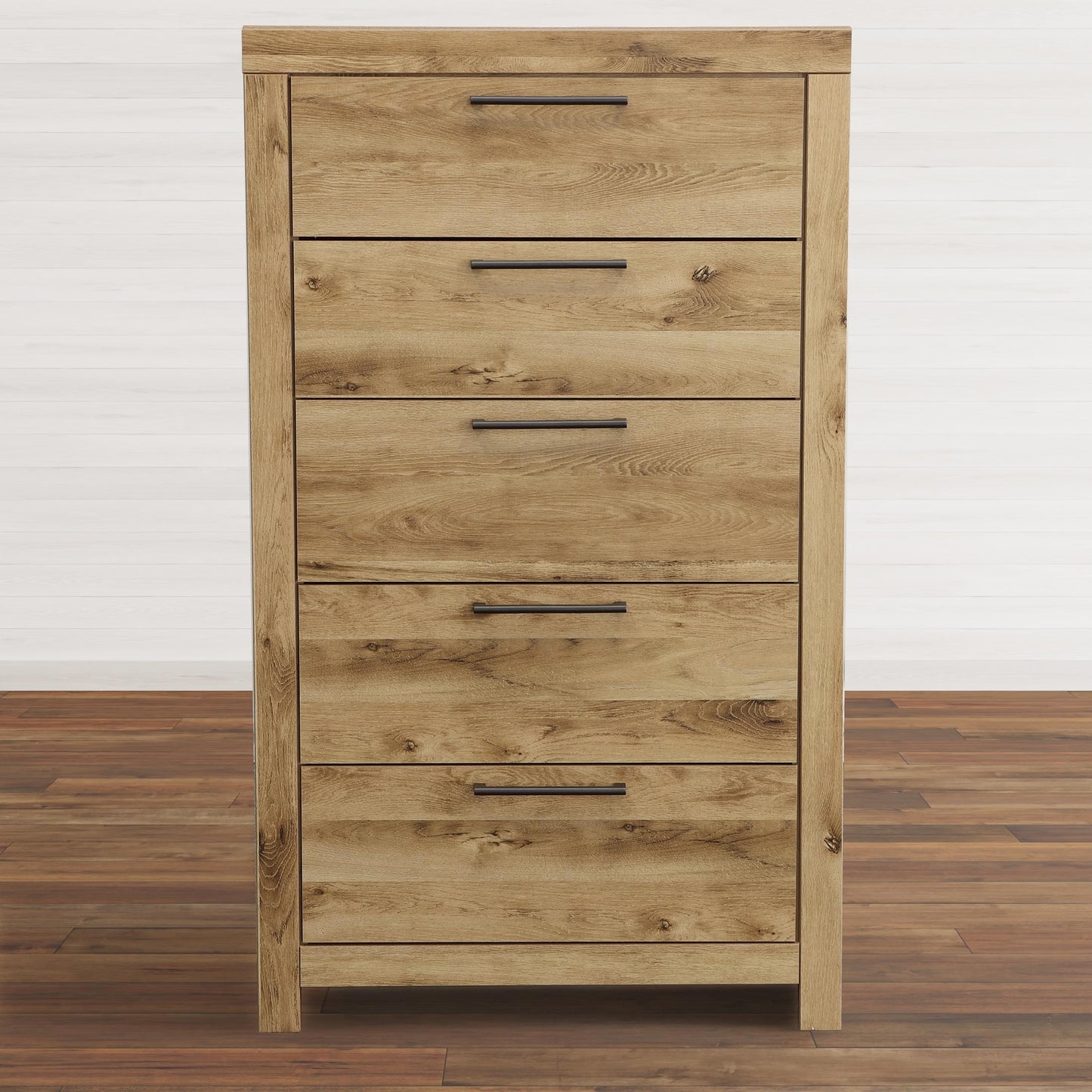 Inspired by natural beauty, refined to perfection. This chest of drawers brings cozy outdoor vibes to your bedroom with its warm and inviting golden rustic finish. Handles in an antiqued gunmetal hue adorn the five drawers on its framed front, adding an industrial touch to the simple, streamlined design.