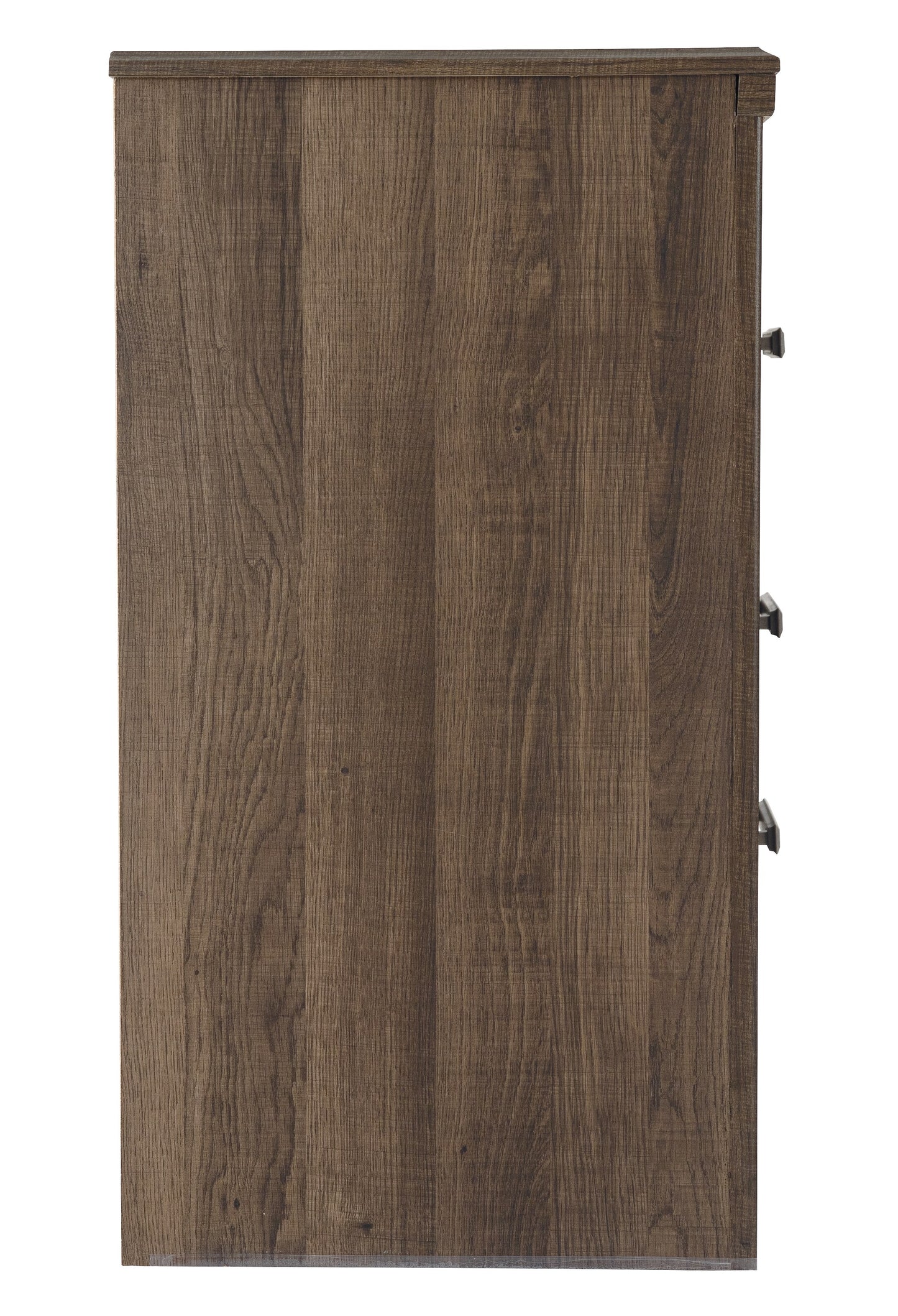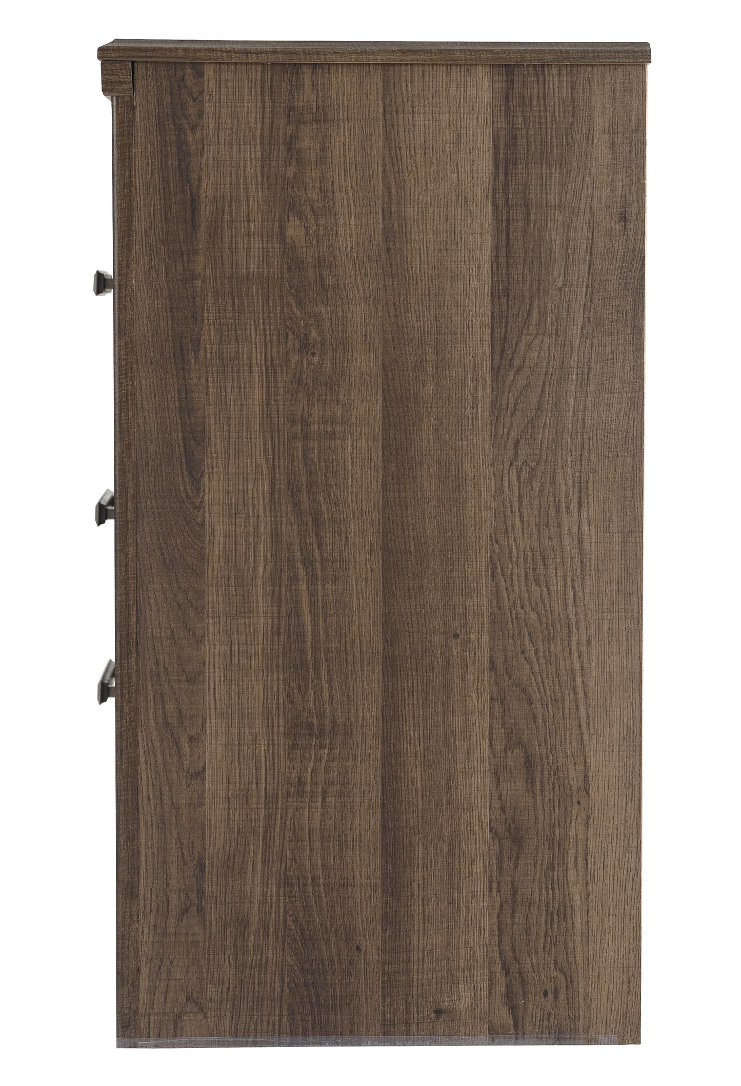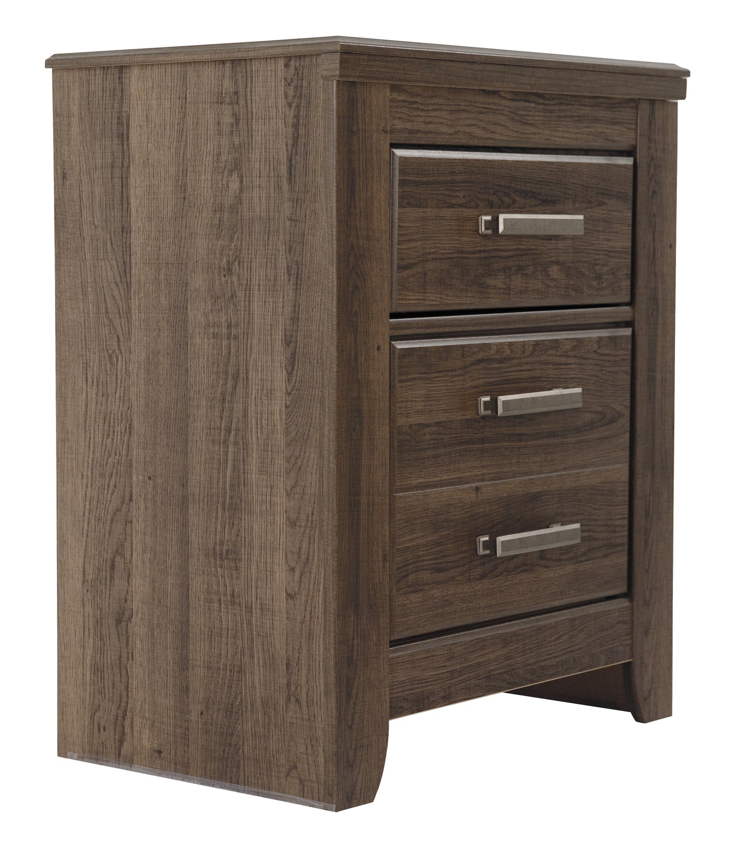 Get the look of posh barn wood without setting foot in a salvage yard. Replicated rough-sawn oak of this nightstand has a vintage finish that is reminiscent of a timeworn family heirloom. Warm, rustic and naturally beautiful, it's just got that ageless appeal. Sleek hardware in a pewter tone is a snappy finishing touch.