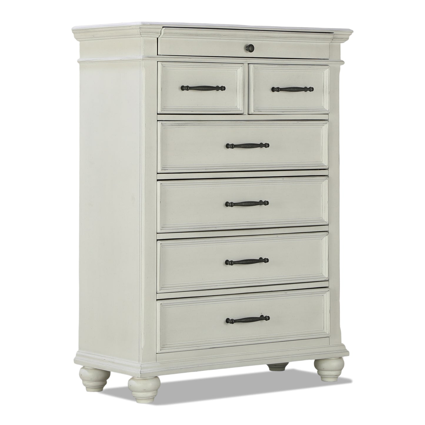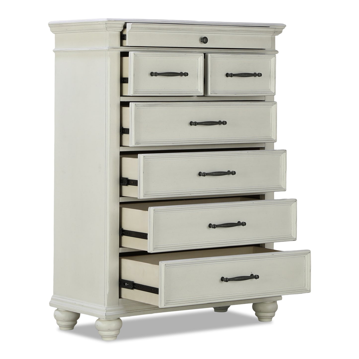 Give your retreat vintage charm with this 7-drawer chest. Sporting a beautifully distressed whitewash finish, it includes seven varied-sized drawers for an organized wardrobe. Generously scaled moulding from top to bottom, along with bun feet and drawer handles with a transitional aesthetic, give this chest character—evoking the feel of a quaint cottage escape.