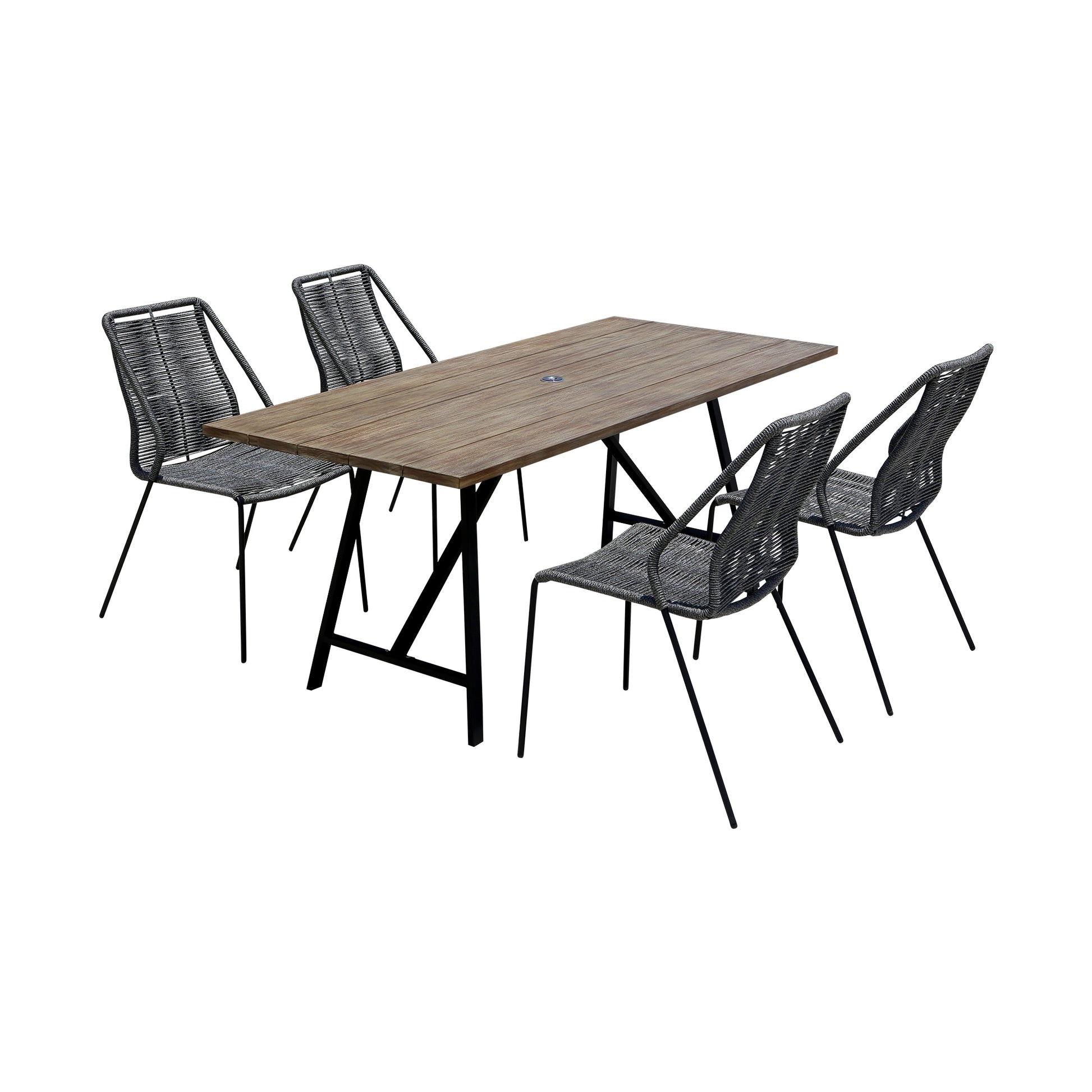 Entertain like a pro with the Koala and Clip 5 Piece Dining Set in Eucalyptus Wood and Metal with Rope. This outdoor dining set comfortably seats up to 4 and is constructed from eucalyptus wood, metal, and durable rope. Modern and inviting, our patio dining table combines the warmth of wood with the hardiness of metal. The clean-lined and minimal profile of the table can effortlessly blend and compliment any outdoor space. One of the best reasons to choose Eucalyptus wood for your outdoor furniture or four-seasons porch is that it is exceptionally resistant to decay and rot. It naturally resists the influence of moisture because of the high oil content it naturally contains.
