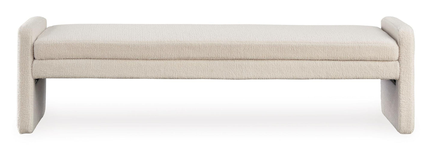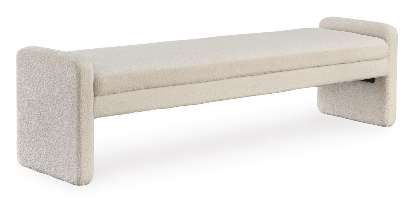 This accent bench helps you craft a cozy space without sacrificing the high-style vibe you love. Clean lines and a simple silhouette give it a contemporary, tailored feel. Inviting faux shearling fabric and rounded edges soften the look. Whether it's at the end of your bed or welcoming guests in the entryway, this piece is sure to make a statement.