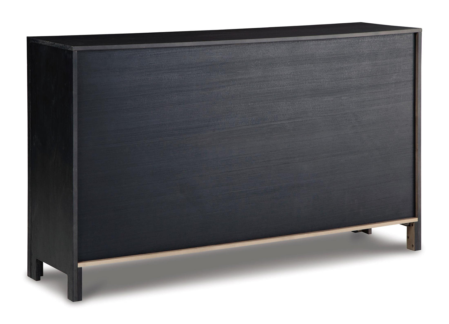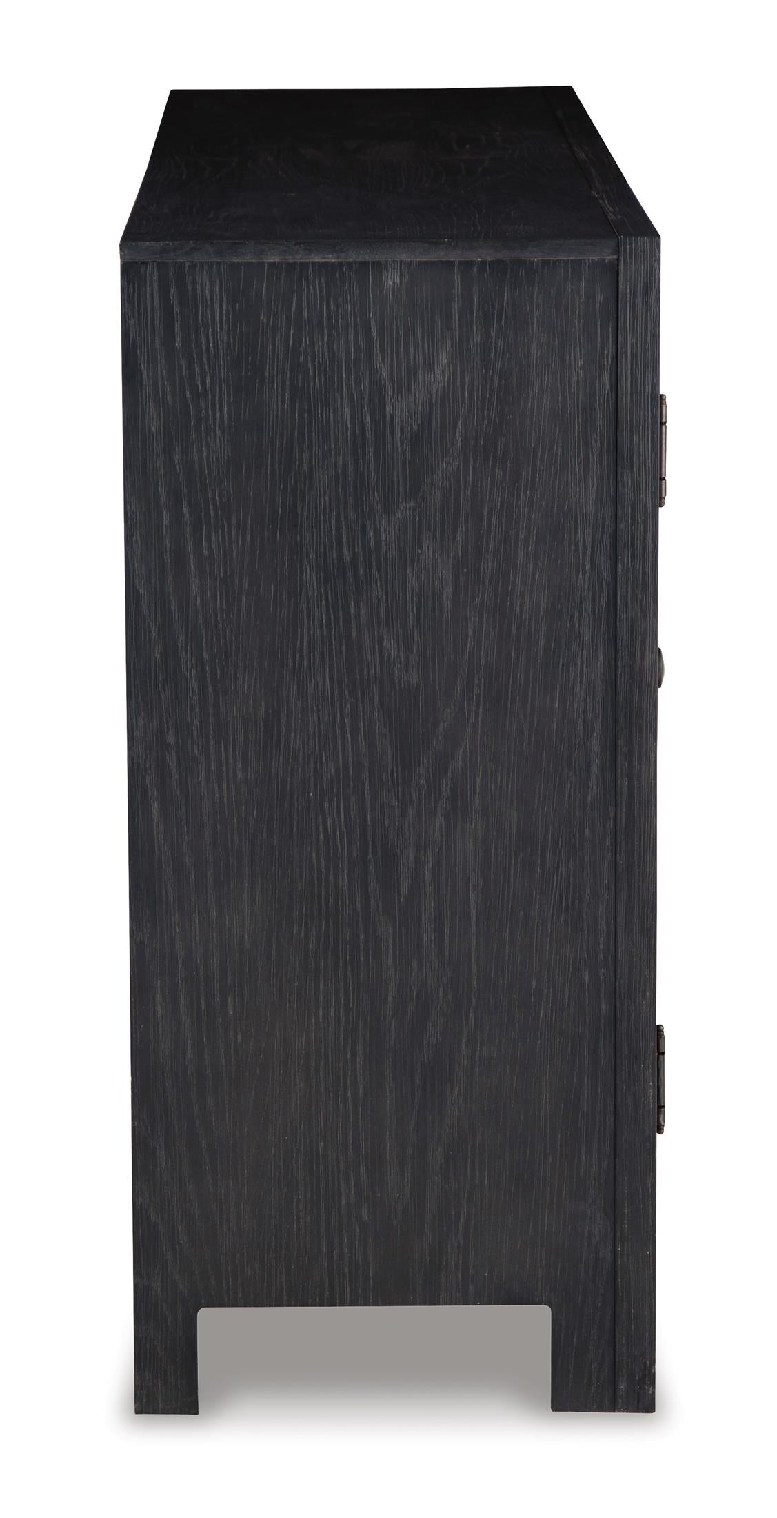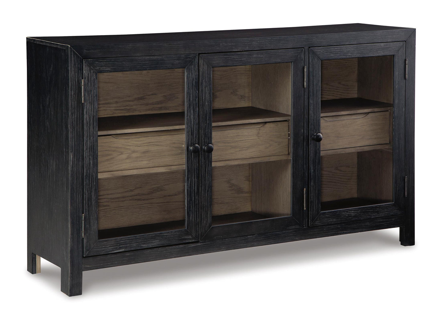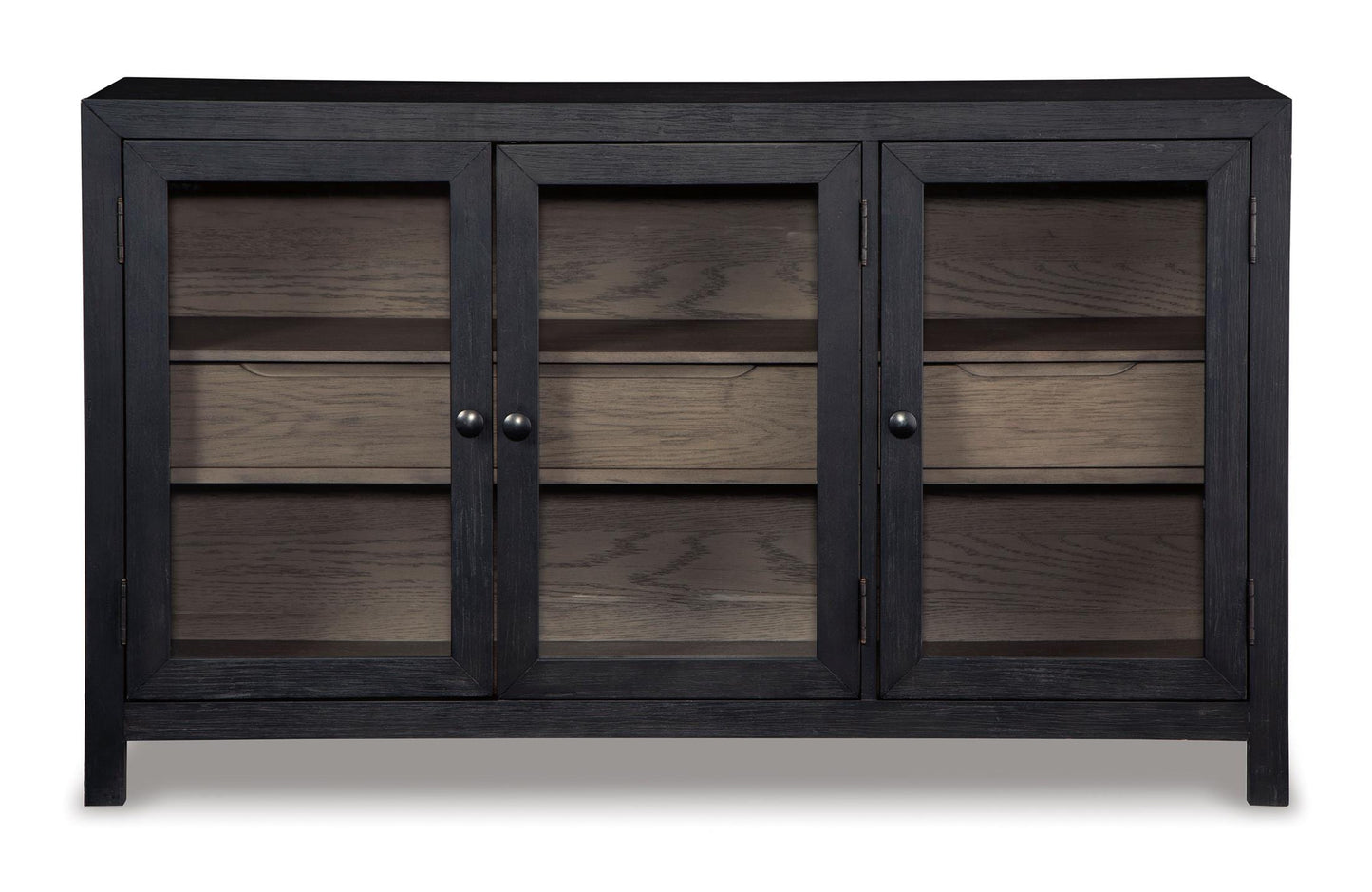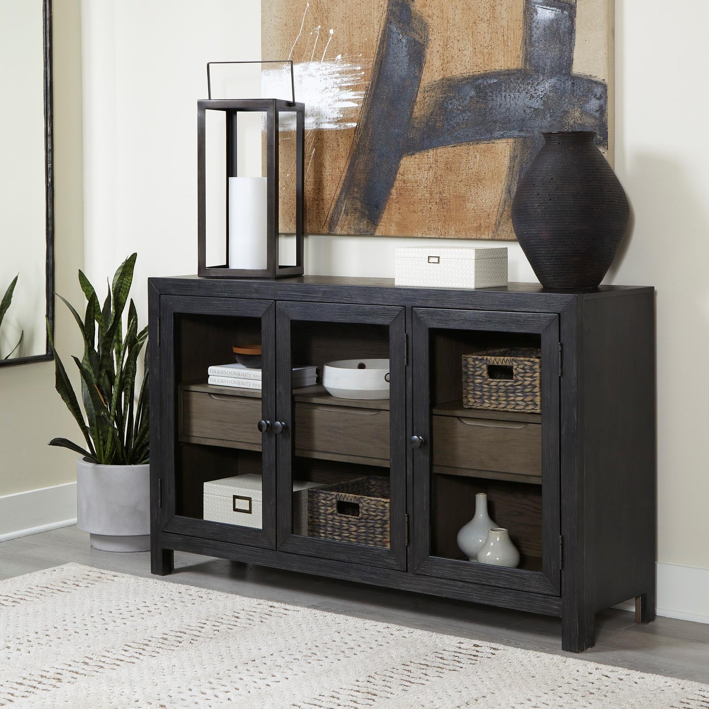 Add layers of form and function to your space with this accent cabinet. It's draped in a black finish on the outside and a warm gray finish inside, for a classic look that seamlessly transitions from casual to modern styles. This accent cabinet's flexible design includes three drawers and two shelves for simple and streamlined storage.