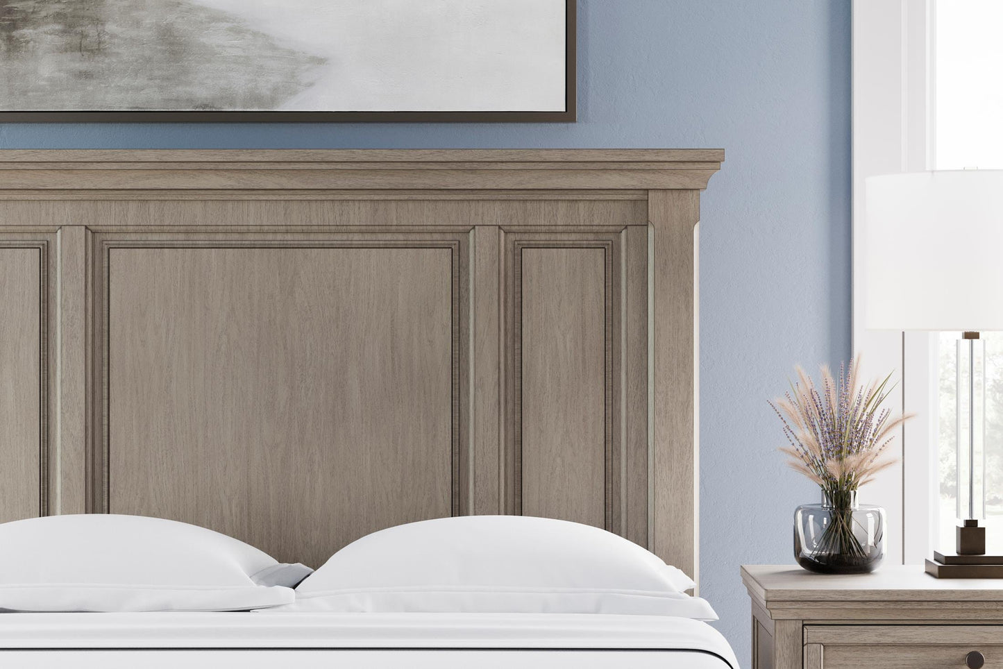 Satisfying your taste for tradition, the Lettner California king panel bed sports serene sophistication. Forever classic design details—inlaid panels and bun feet—are so easy to love. Burnished light gray finish elevates the look with modern sensibility, so you can sleep in style. Mattress and foundation/box spring available, sold separately.