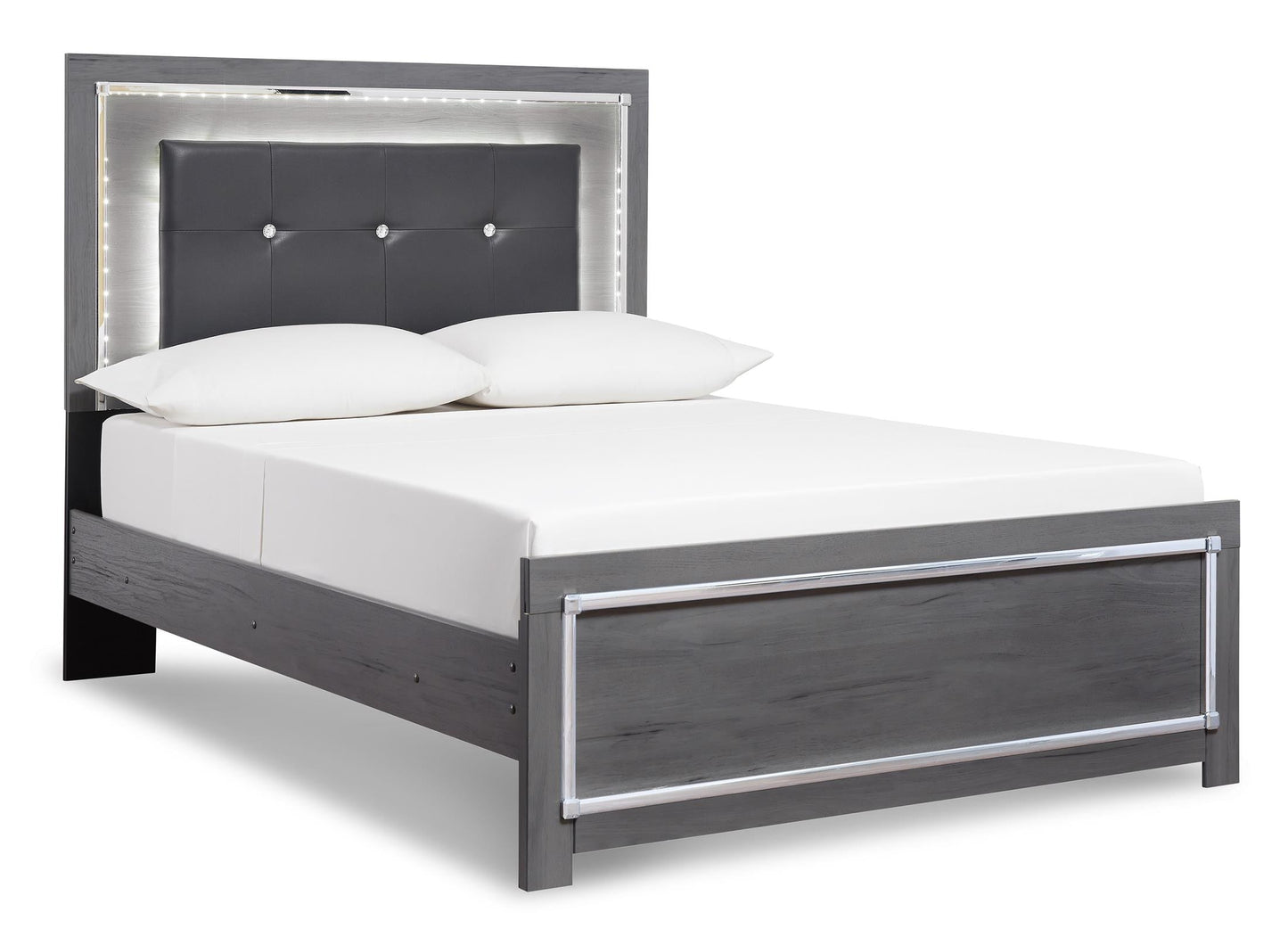 Reminiscent of Hollywood glamour of yesteryear, this king panel bed interprets luxury in a decidedly modern way. Sumptuous details include button-tufted upholstery, faceted faux crystals and chrome-tone accents beautifully lit by LED lights enhanced with remote-controlled settings for color and brightness.