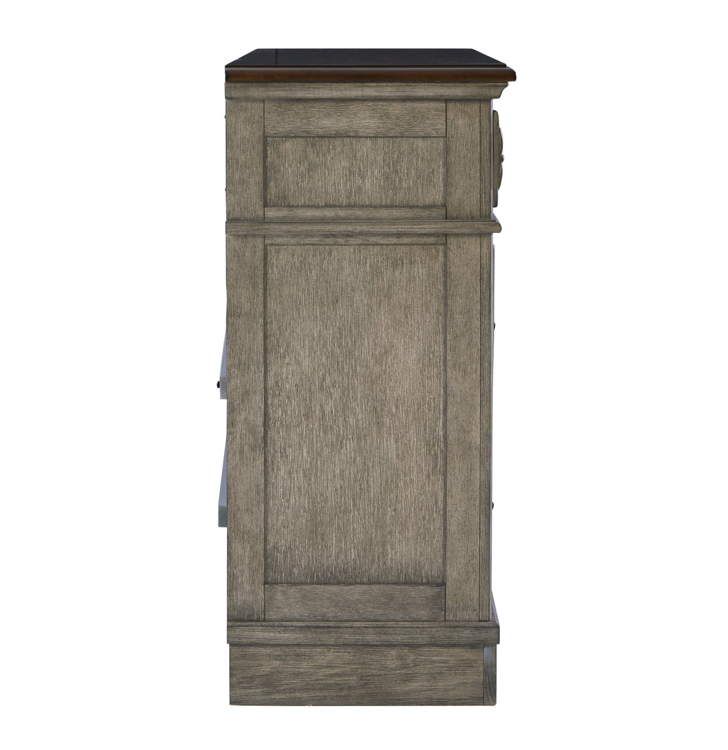 Cottage quaint styling and quality construction make this dresser a dream come true. A two-tone finish provides rustic warmth, with an antiqued gray body and a rich, deep walnut on the top. Framed drawer fronts and dark bronze-tone hardware marry classic elegance and homey charm. Seven smooth-gliding drawers are crafted with quality dovetail construction.