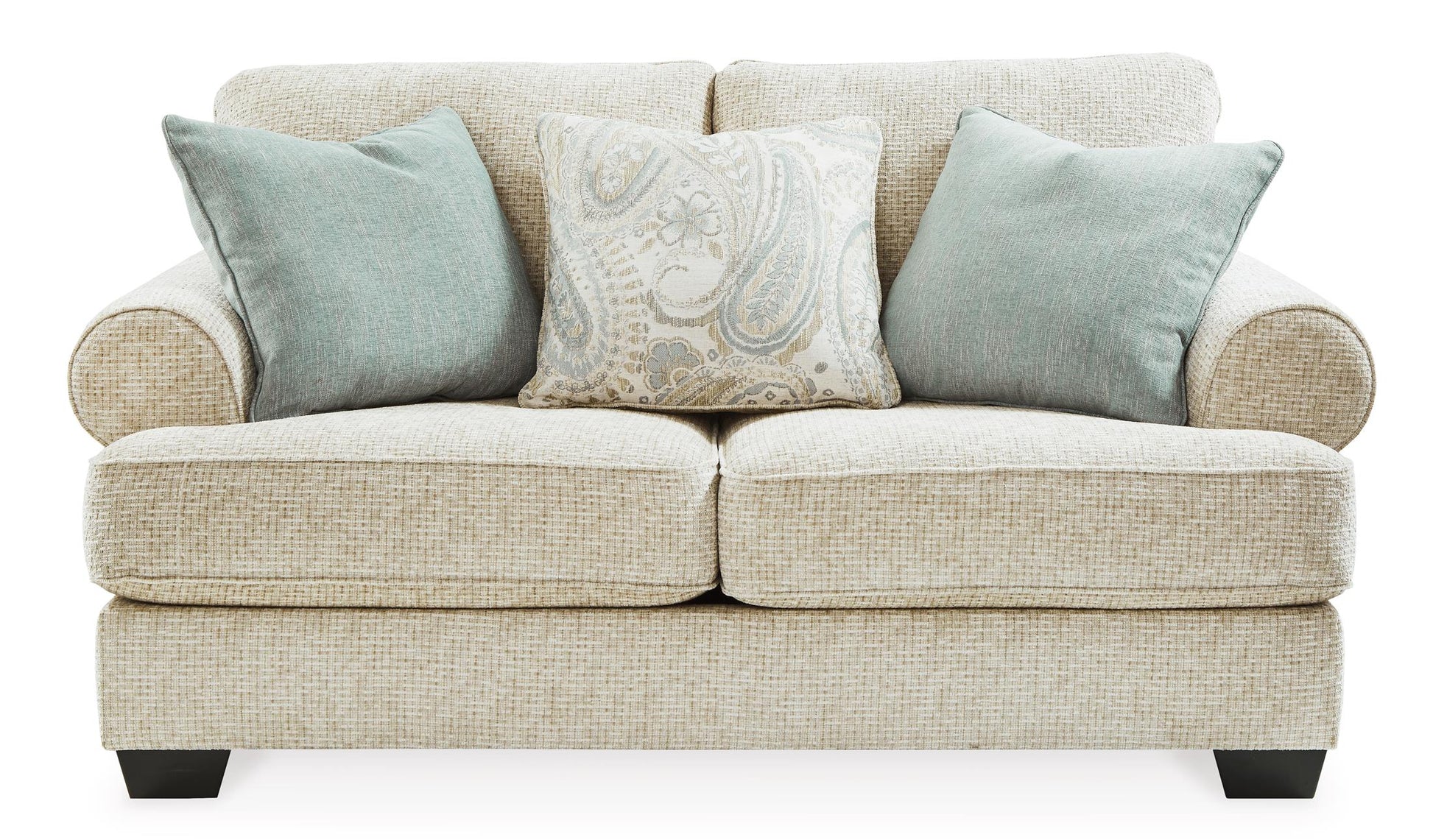 This loveseat strikes a beautiful balance between classic and current. Its traditional elements include t-cushion seating and setback roll arms, angled for modern flair. Posh pillows in spa mist and jacquard paisley make a muted, mellow complement to the loveseat’s casual textured chenille upholstery. And the choice of sandstone beige is a light and lovely style awakening.