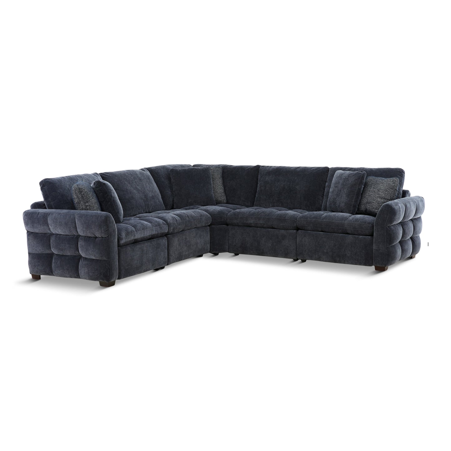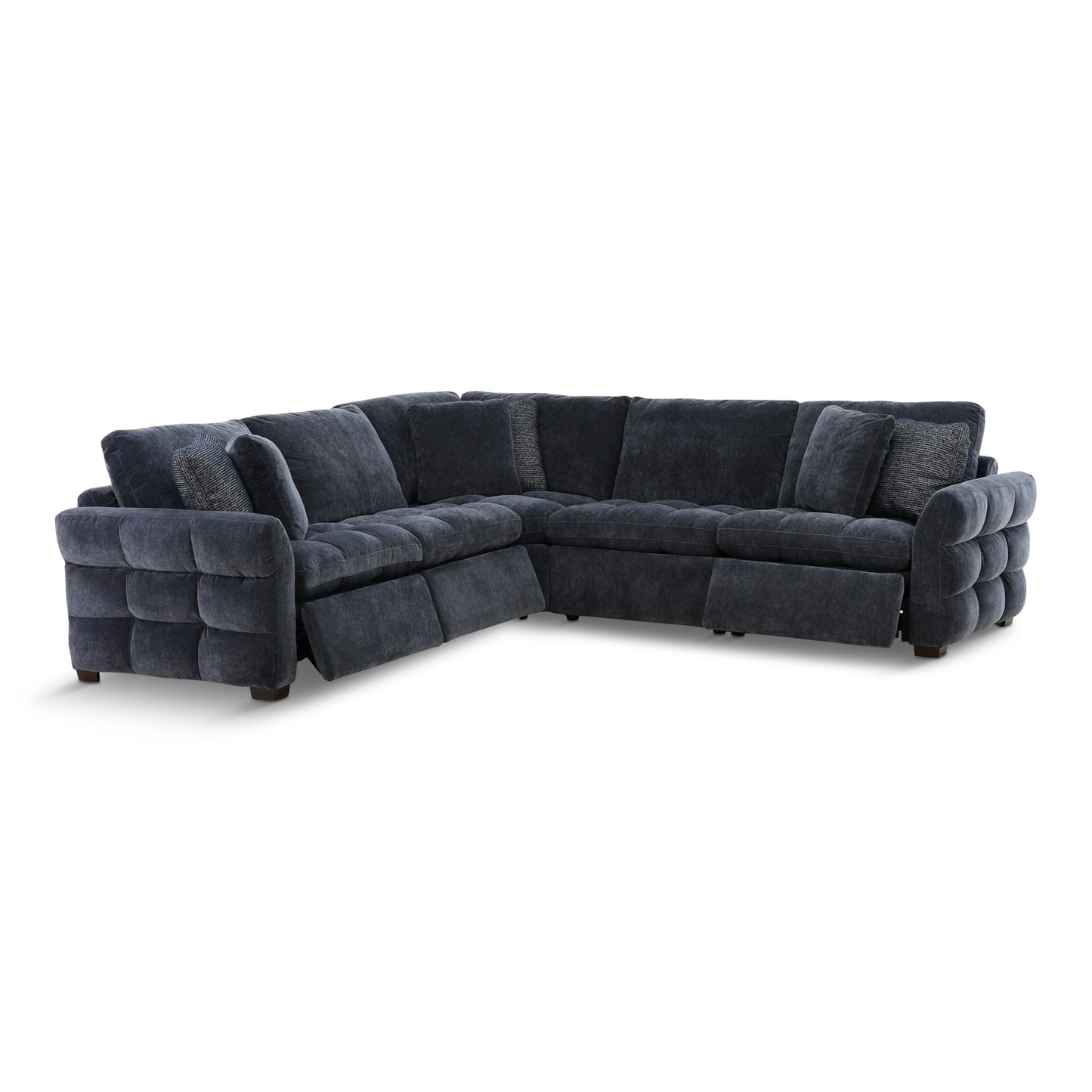 This modular reclining collection looks like a stationary collection. Individually pocketed seat and back cushions are filled with feather/fabric blend pillows. This is covered in a very soft fabric that is great for families.