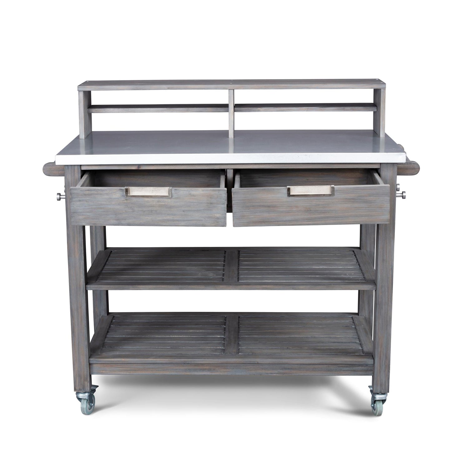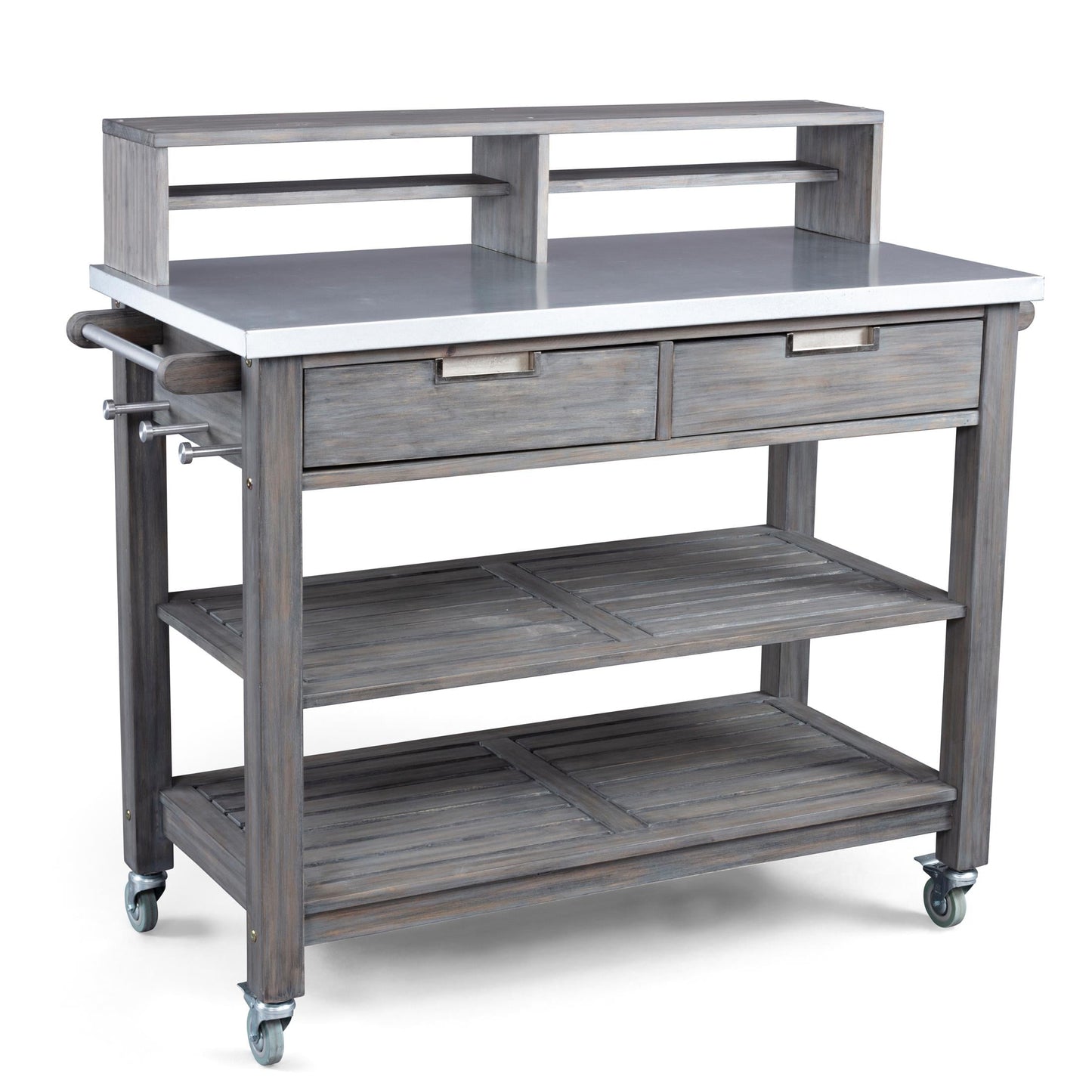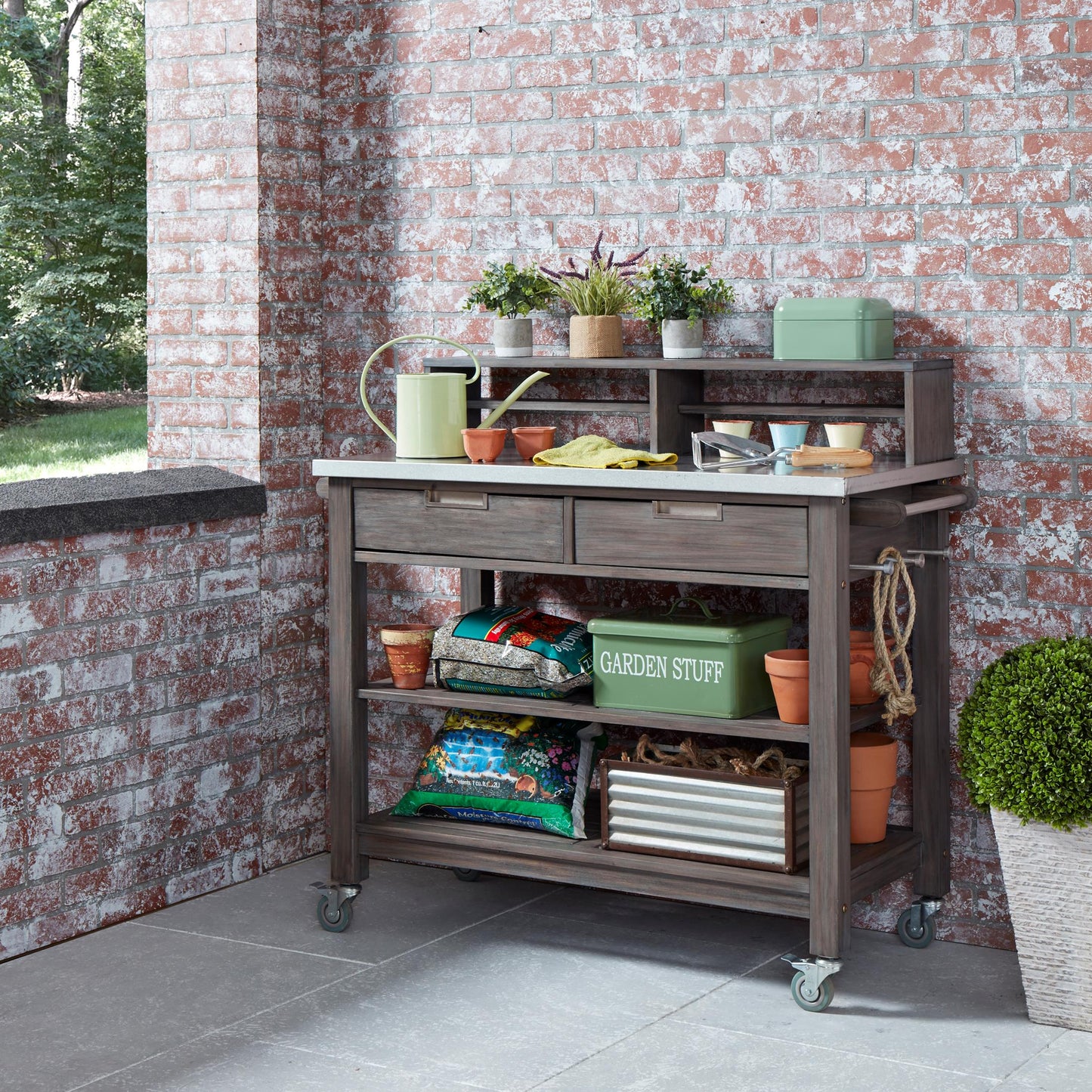 Become a master gardener or simple master your outdoor spaces with this Homestyles Maho Potting Bench. The design adds a little island flair to your outdoor spaces, and the worksurface and storage shelves add plenty of storage capability. The entire bench is constructed of durable, water-resistant acacia wood for years of reliable performance.