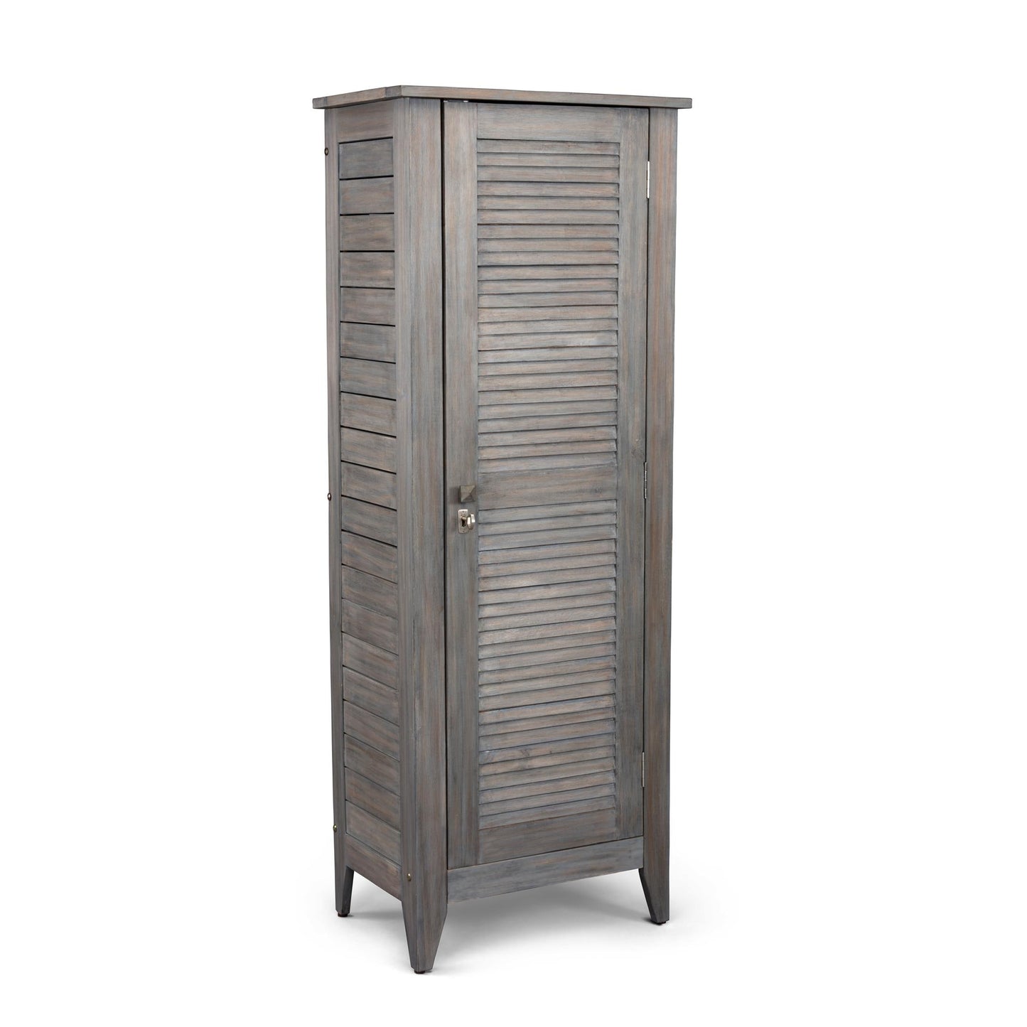A smart storage solution with island style. The Maho Storage Cabinet by homestyles is crafted of solid, water-resistant acacia with a gray teak finish and sealed with linseed oil to bring out the wood's natural beauty. Three adjustable, removable shelves let you customize the space for yard tools, pool noodles, or other long items. The front door locks, and all hardware is stainless steel.