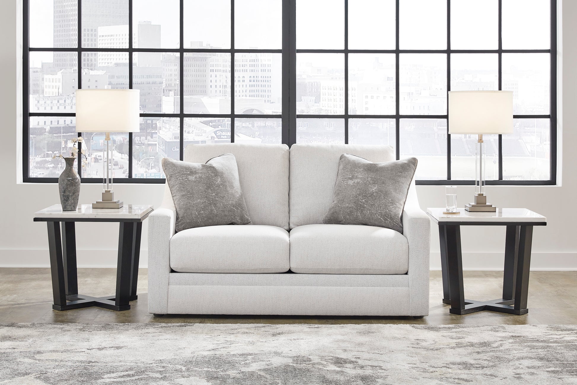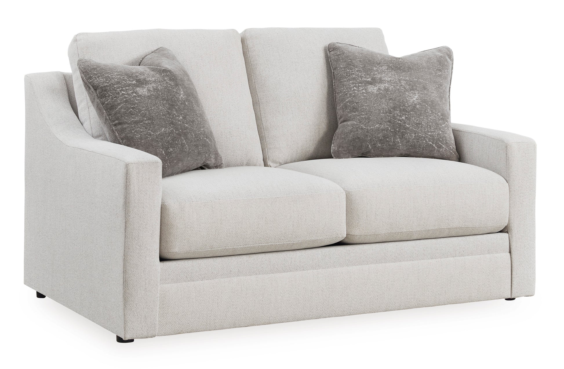 Clean lines and a streamlined silhouette define the architectural attitude of this loveseat. Textured accent pillows in complementary colors add subtle contrast. The loveseat's plush reversible cushions beckon you to sit down, get comfy and relax completely.
