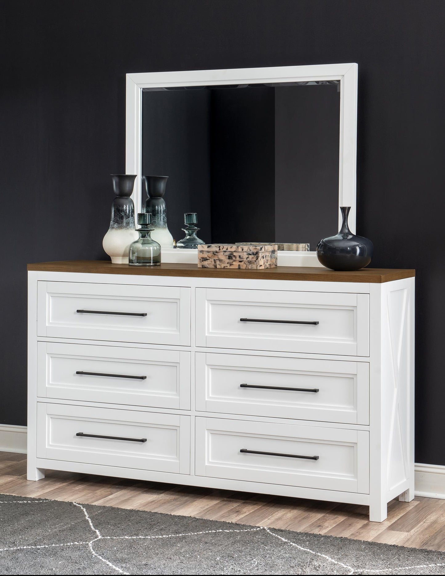 Tactile, yet refined, and always modern. Clean lines meld with comfortable textures and tones in the Manhattan bedroom collection. Simple farmhouse details such as block feet, beveled framed drawer fronts, planking and X motifs create visual interest in a modern way and without feeling too cluttered. Dark Oak tops on quartered white oak veneer sit atop Natural White painted bases.