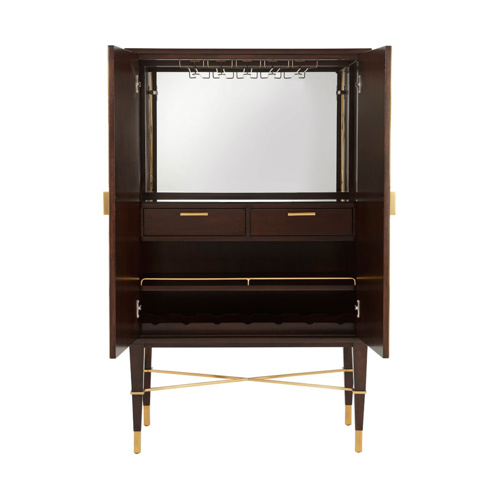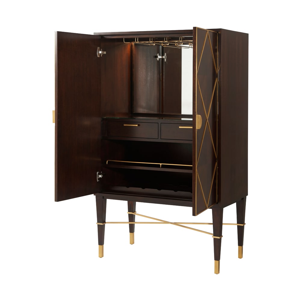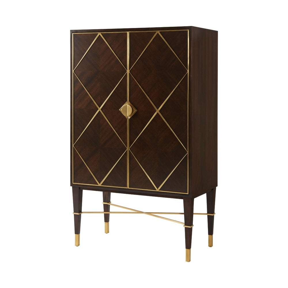 An intoxicating bar cabinet! Mahogany parquet door fronts are overlaid with geometric brass diamond trim and Y handles. Set on square tapered legs with a brass X stretcher. Inside, Max fulfills his liquor cabinet mission: LED-lit with mirror back, glass hangers, galleried shelf, wine rack and two drawers.