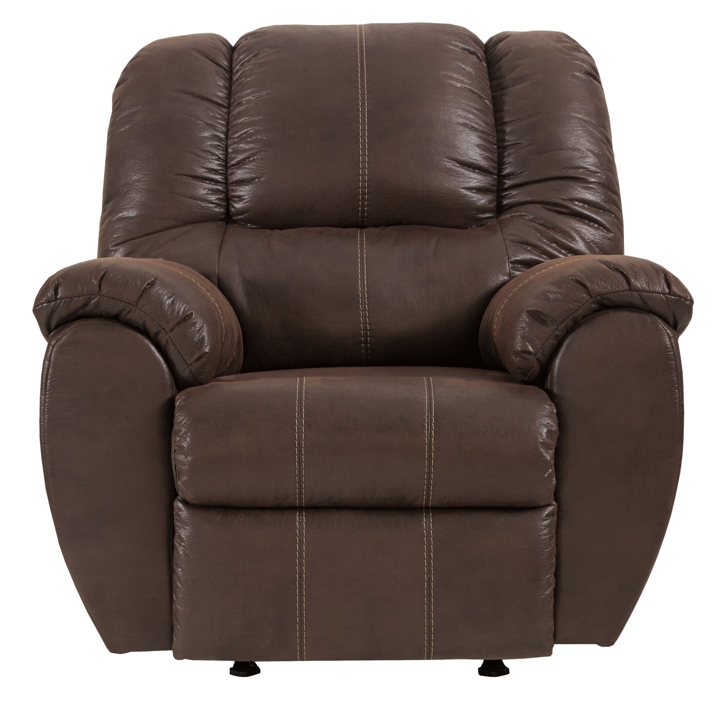 Rock the cool look of leather and the warm feel of fabric with the McGann rocker recliner. Sporting sumptuously thick cushioning, fashion-forward jumbo stitching and a richly tailored aesthetic, this smartly priced recliner with gentle rocking motion is a bestseller for good reason.