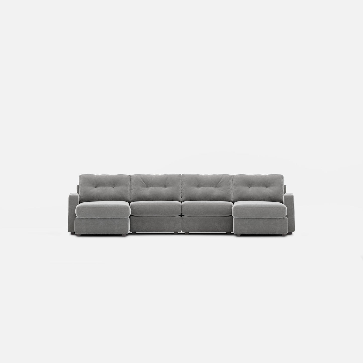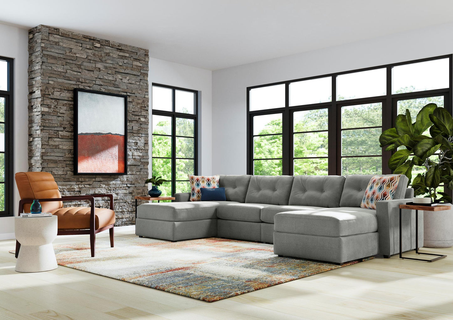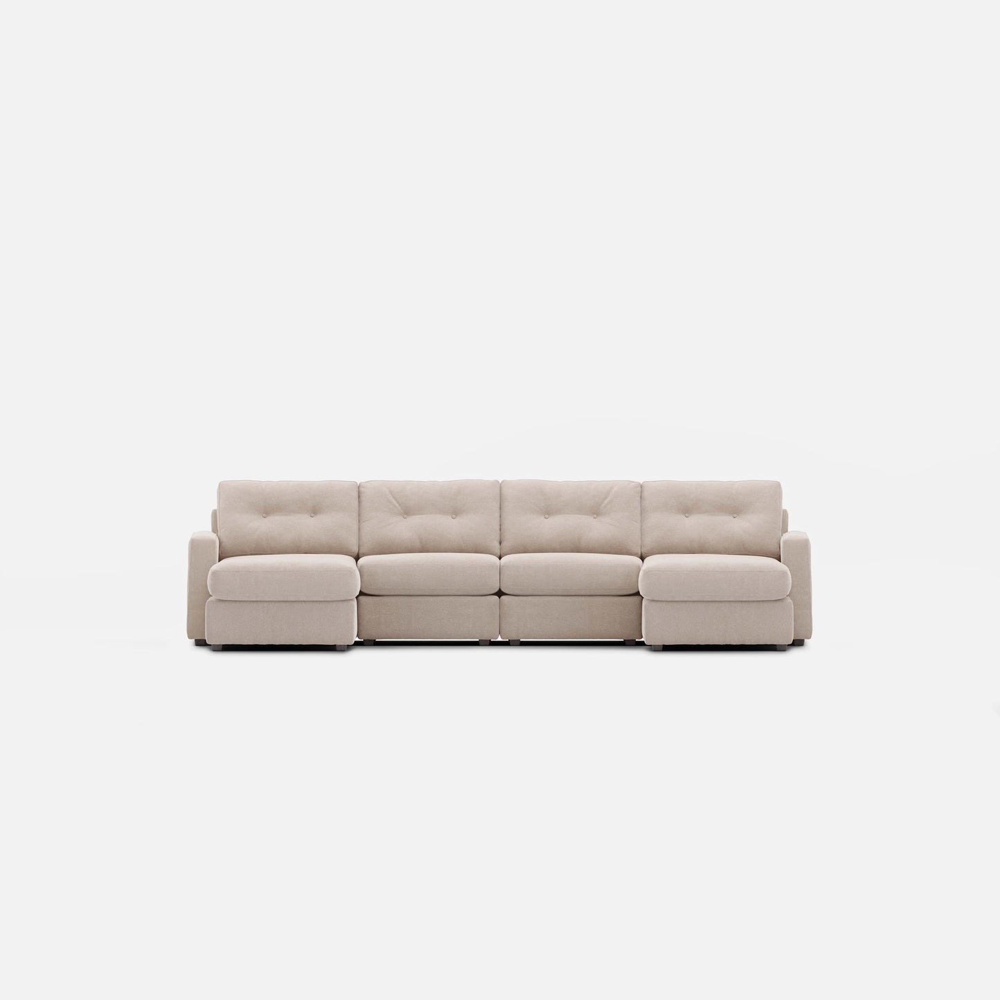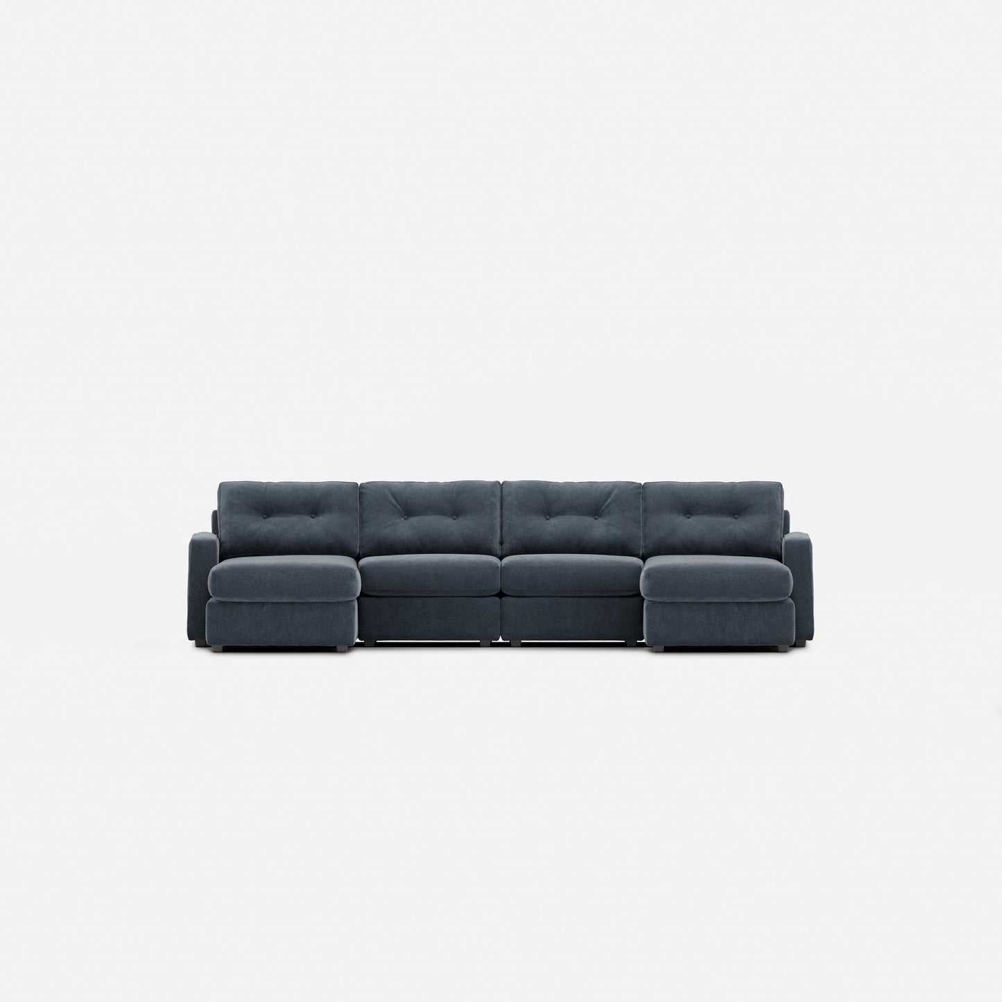 True modular designed with maximum versatility and functionality. A new modern basic, this tailored silhouette features welted track arms, top stitched seat cushions and button tufted backs. Soft environmentally conscious Repreve fabric that uses approximately 9 recycled plastic bottles for each yard of fabric. Build a version for any room requirement.
