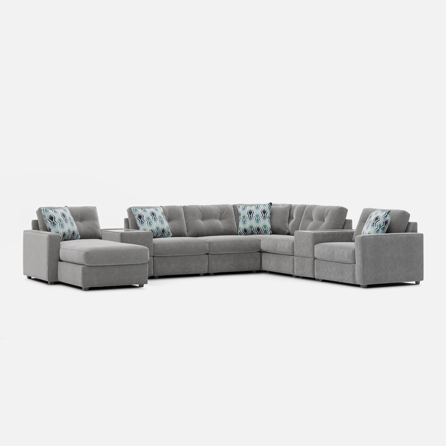 True modular designed with maximum versatility and functionality. A new modern basic, this tailored silhouette features welted track arms, top stitched seat cushions and button tufted backs. Soft environmentally conscious Repreve fabric that uses approximately 9 recycled plastic bottles for each yard of fabric. Build a version for any room requirement.