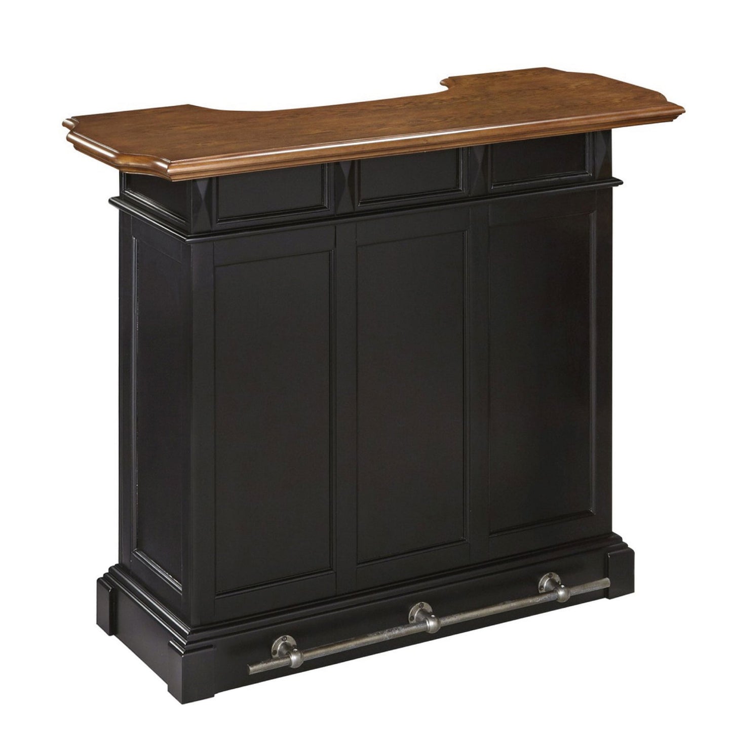 Transform your bar or kitchen into a comfortable place to gather with our homestyles Montauk Bar. It features cabinets with raised panel fronts and a hand-applied antiqued black finish. Constructed of solid poplar with oak veneers over engineered wood, it features a physically distressed, oak-finished top with worm holes, fly specking, and small indentations. Other features include one storage drawer, one door with cabinet storage, four shelves (two adjustable), and a brushed nickel metal foot rest.