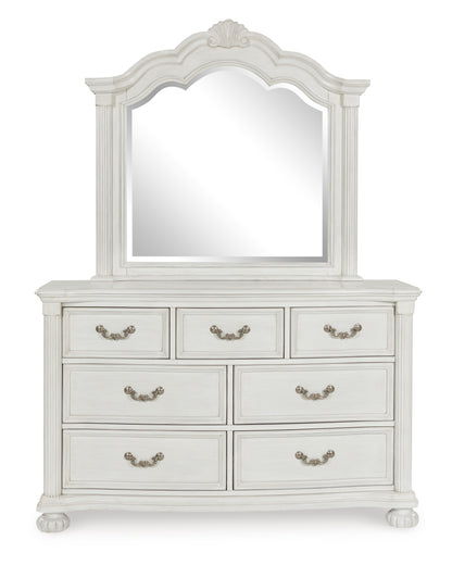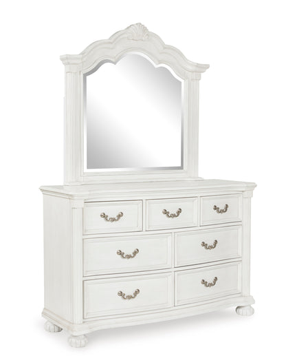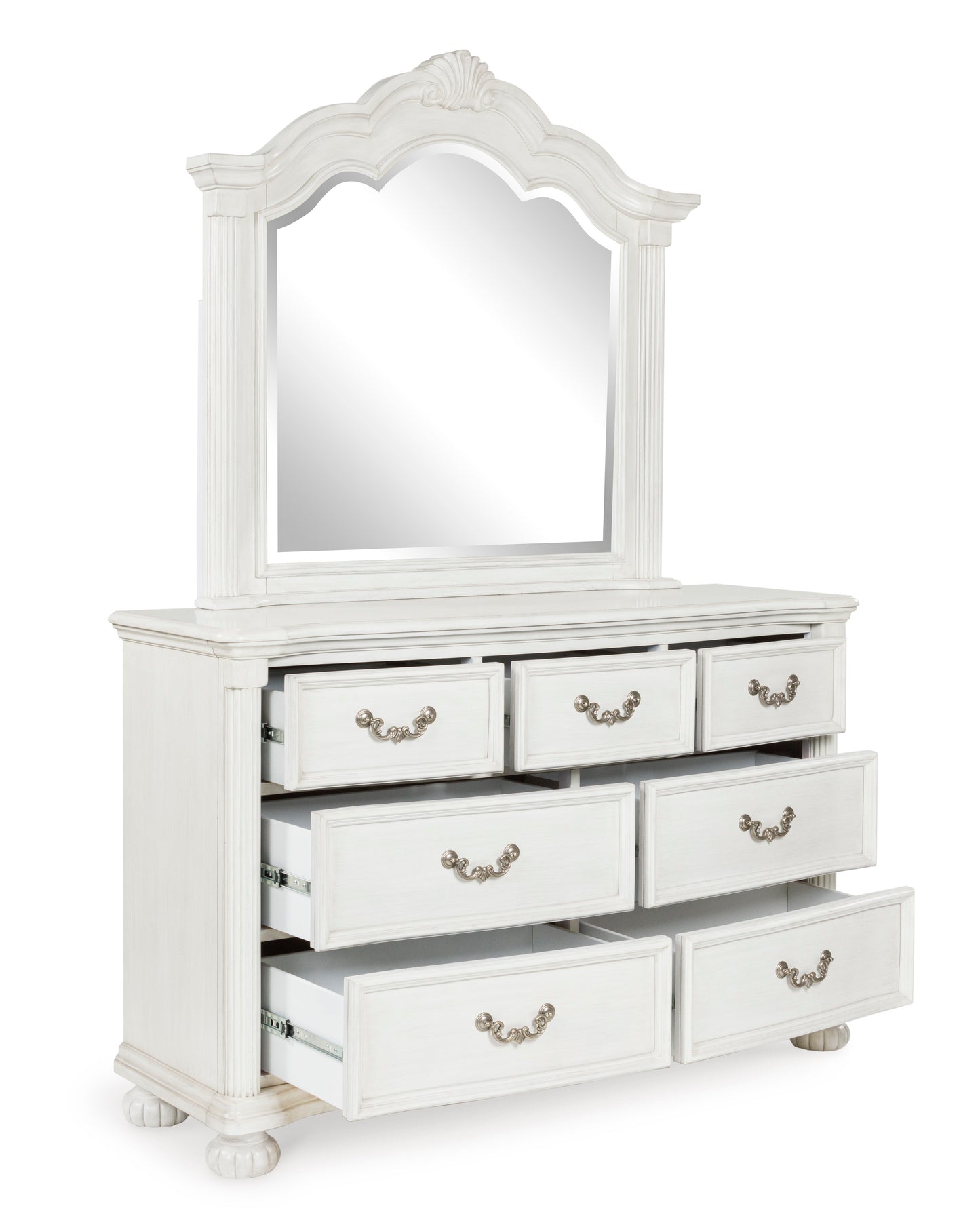 Transform your inner sanctum into a haven of timeless elegance and functionality. This traditionally styled dresser with mirror is adorned in a classic antiqued white finish, highlighted by a serpentine-shaped front with thick decorative moulding. Its drawers are packed with ample storage possibilities. And did we mention the mirror's crowning glory? Talk about relaxed refinement.