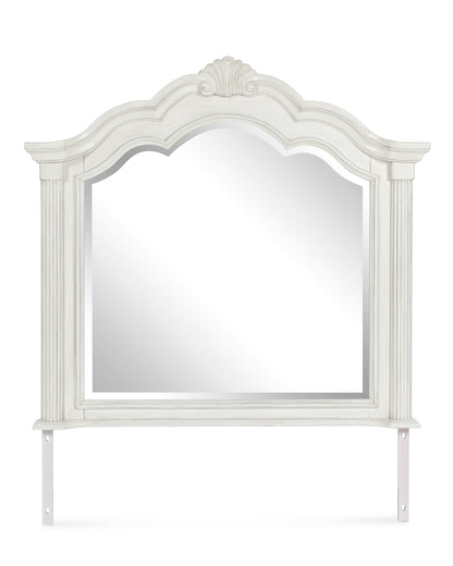 This bedroom mirror is made with hardwood solids and cast resin components. Pairs with other items in the series to make a dresser and mirror kit.