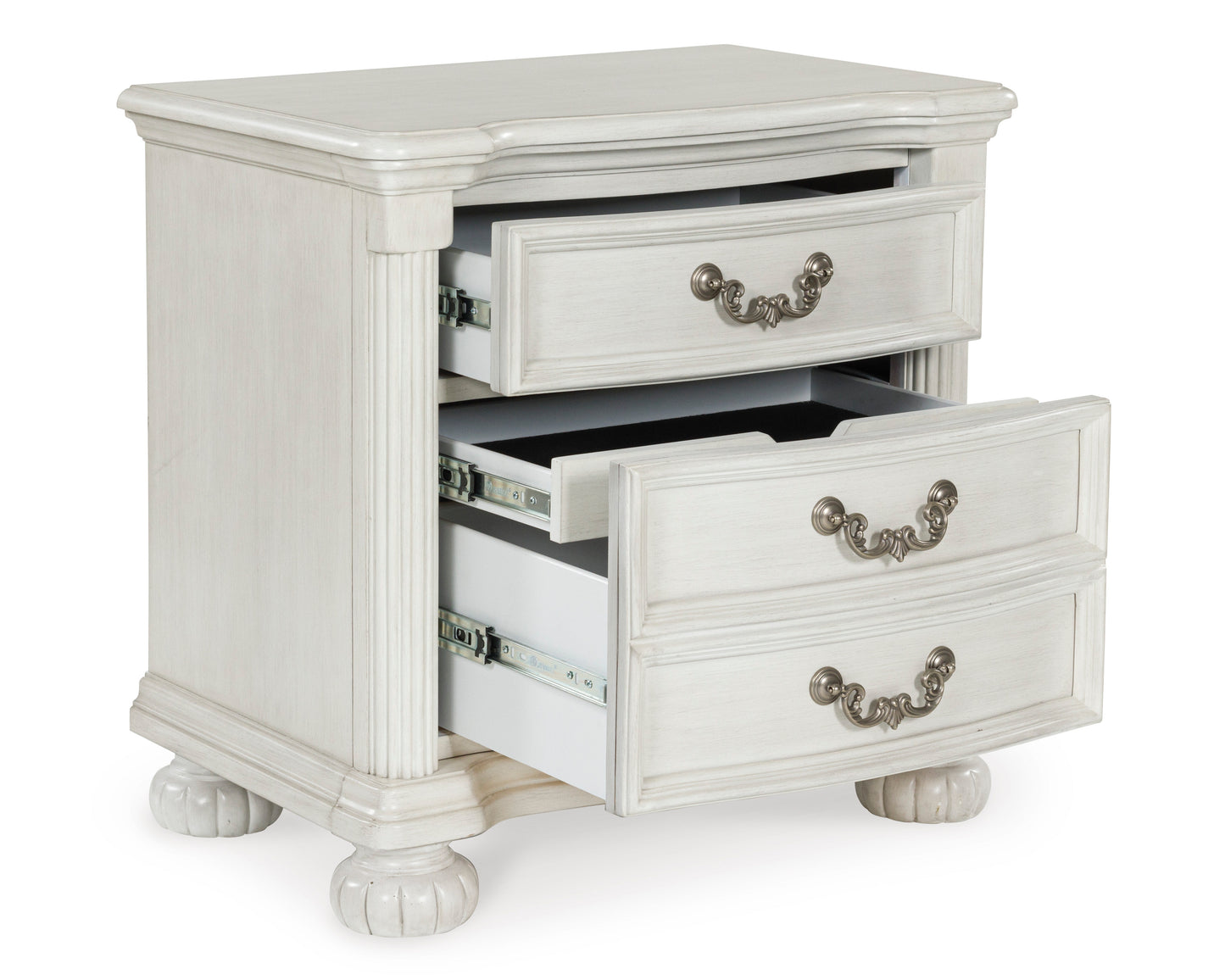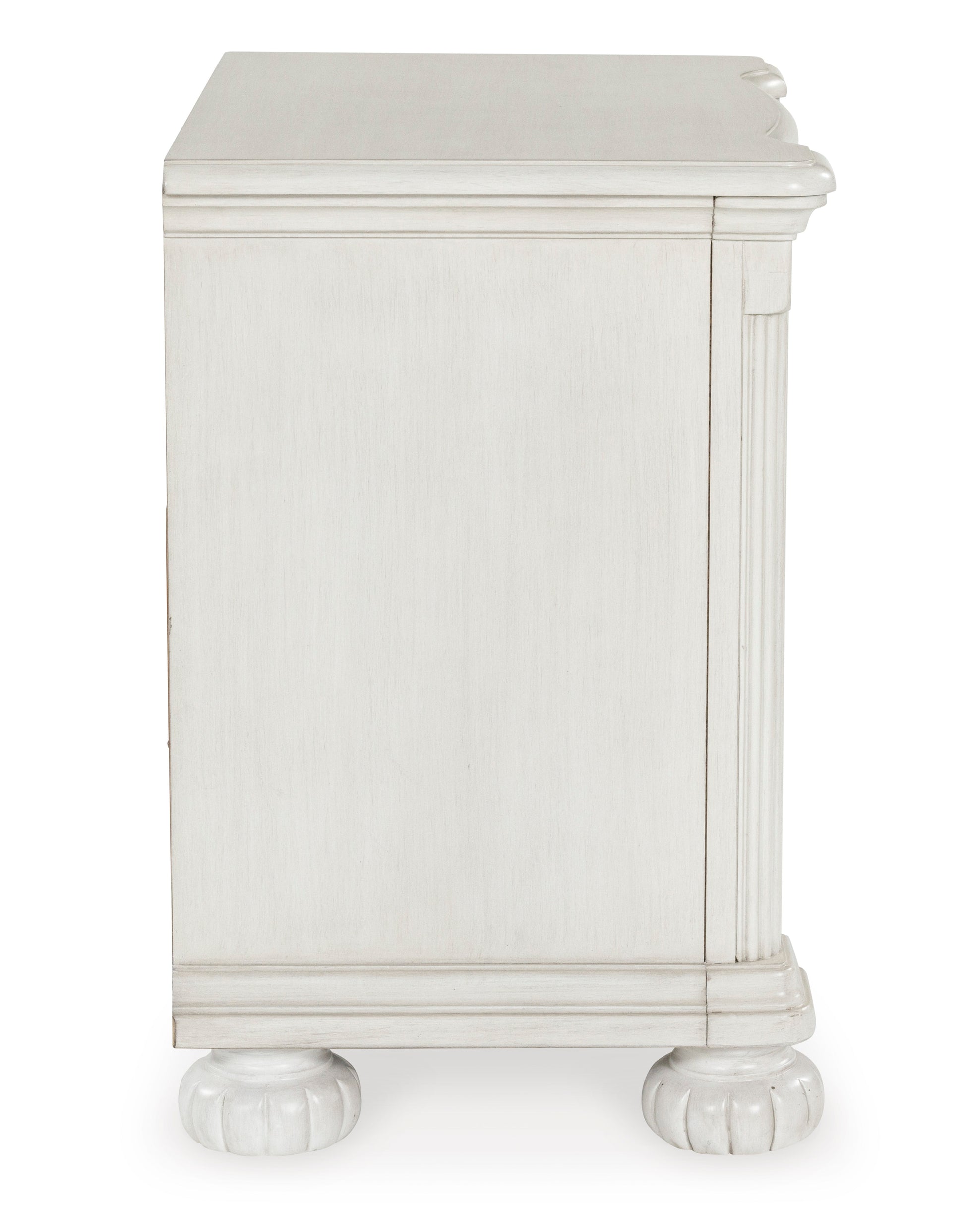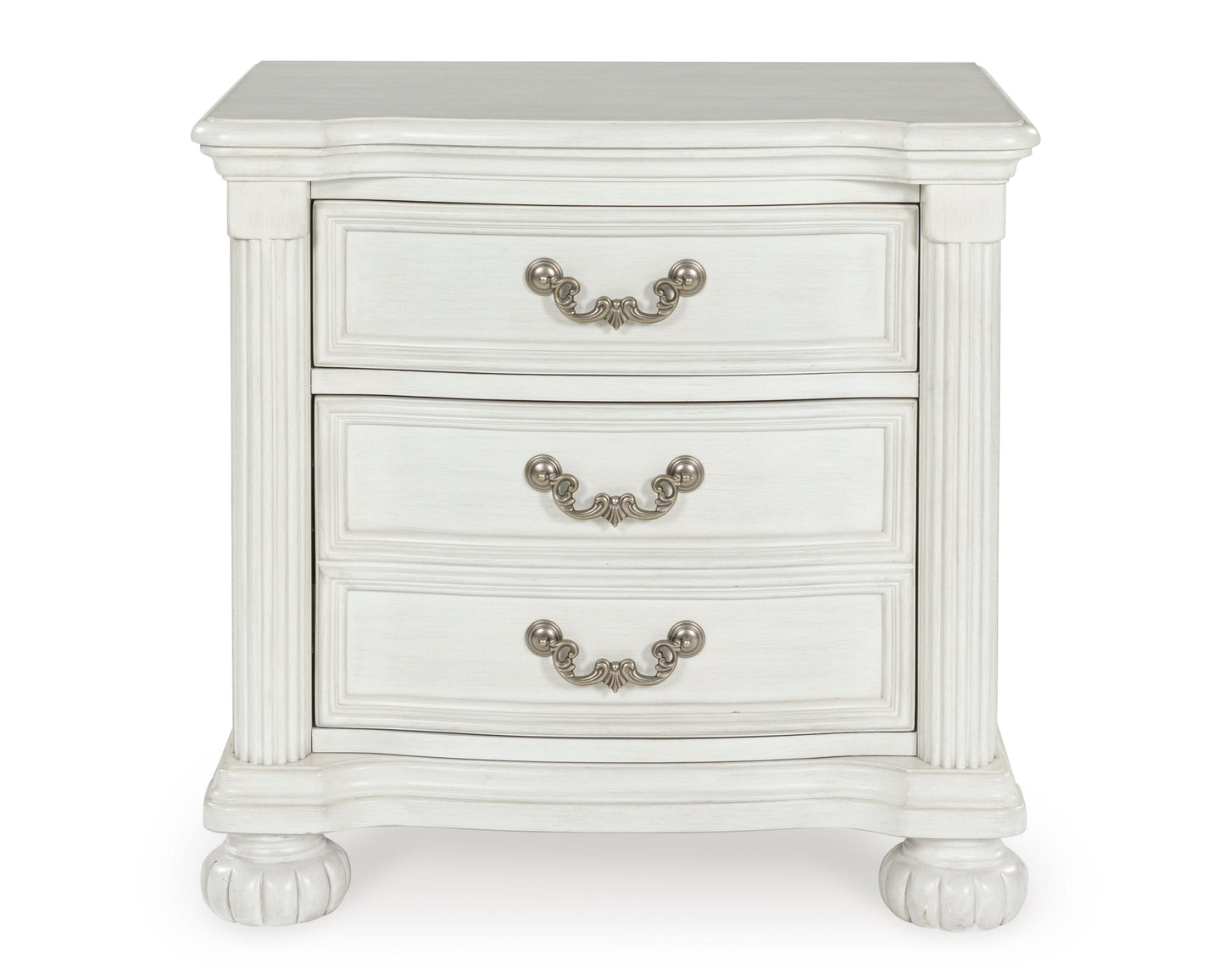 Transform your inner sanctum into a haven of timeless elegance and functionality. This traditionally styled nightstand is adorned in a classic antiqued white finish, highlighted by a serpentine-shaped front with thick decorative moulding. Its drawers are packed with ample storage possibilities, and a hidden pull-out tray behind the bottom drawer puts your small valuables out of sight. And did we mention the stylish reeded bun feet? Talk about relaxed refinement.