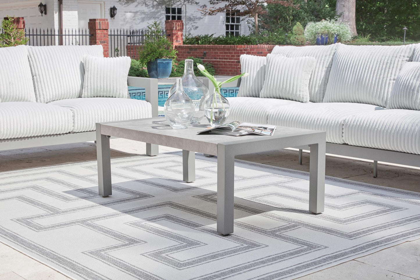 Indulge in luxe outside living without sacrificing longevity. This outdoor coffee table combines natural beauty with a sleek aluminum frame. Soak up the sun poolside or on the porch—it’s the perfect perch for drinks or a snack-filled serving tray. And with a chic gray stone tabletop, style and durability go hand in hand.