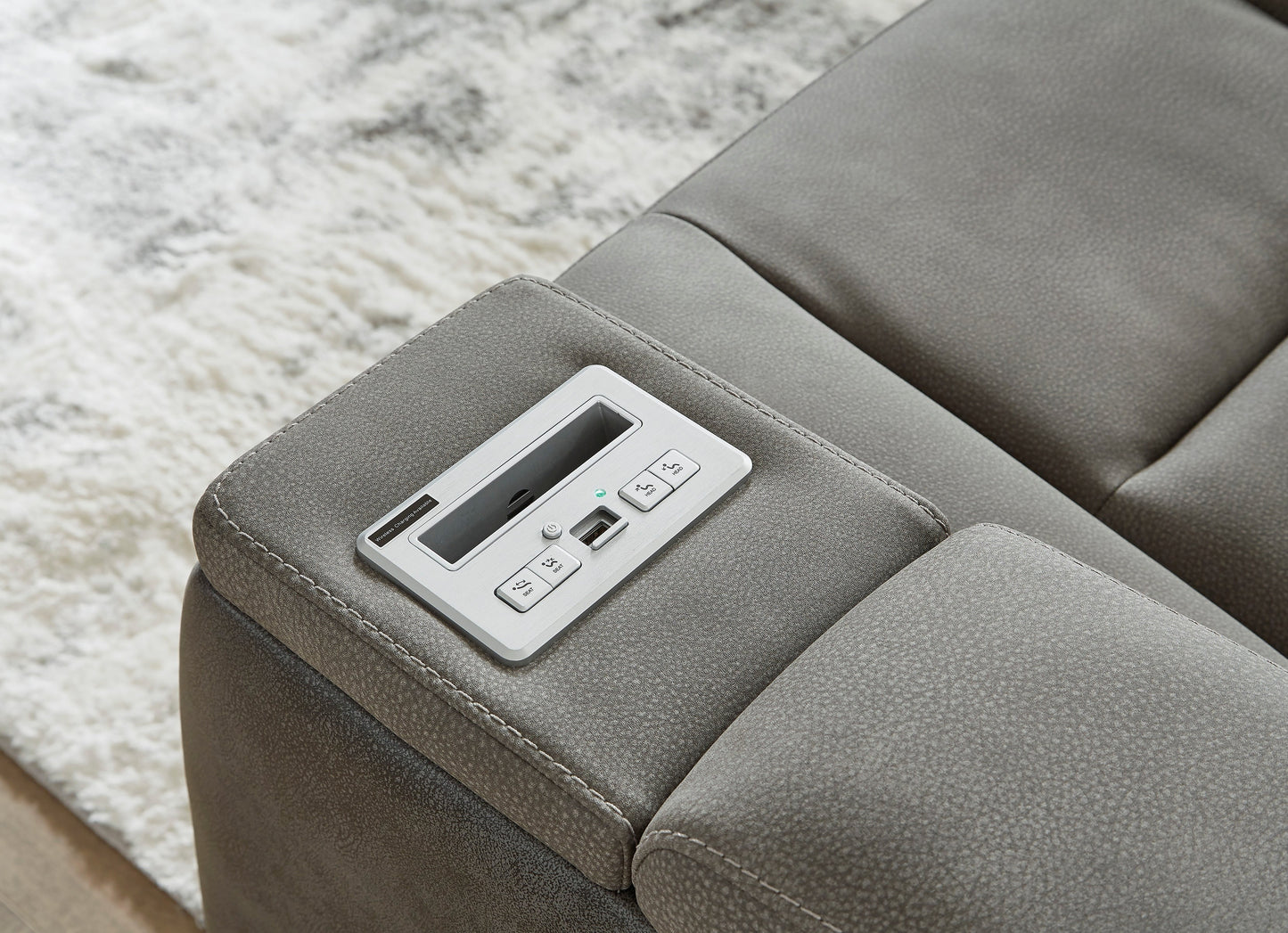 This sleek, ultra-modern power reclining loveseat has it all. With designer looks and head-to-toe comfort, the reclining loveseat with console has the upscale look of leather at a scaled-down faux leather price. Its two-tone Durapella upholstery is more durable and water-repellent than regular leather, an added bonus for families with children or pets. Features including wireless and USB charging, an adjustable headrest and an extended "zero-gravity" ottoman for improved circulation make this the next generation of power recliners.