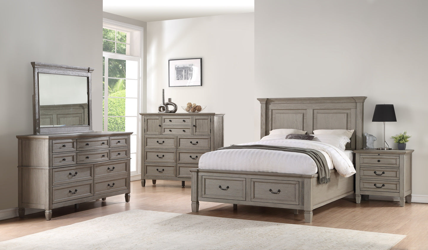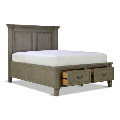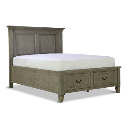 The Orchard Queen Storage Bed is warm, inviting and fashionably chic, creating the retreat of your dreams. The vintage inspired collection features a multi-step, antique gray hand applied finish. Unique details such as the mantel ends on the panel headboard, tapered feet and antique hardware add to the overall charm. Extra storage is incorporated, with the storage footboard panel bed.