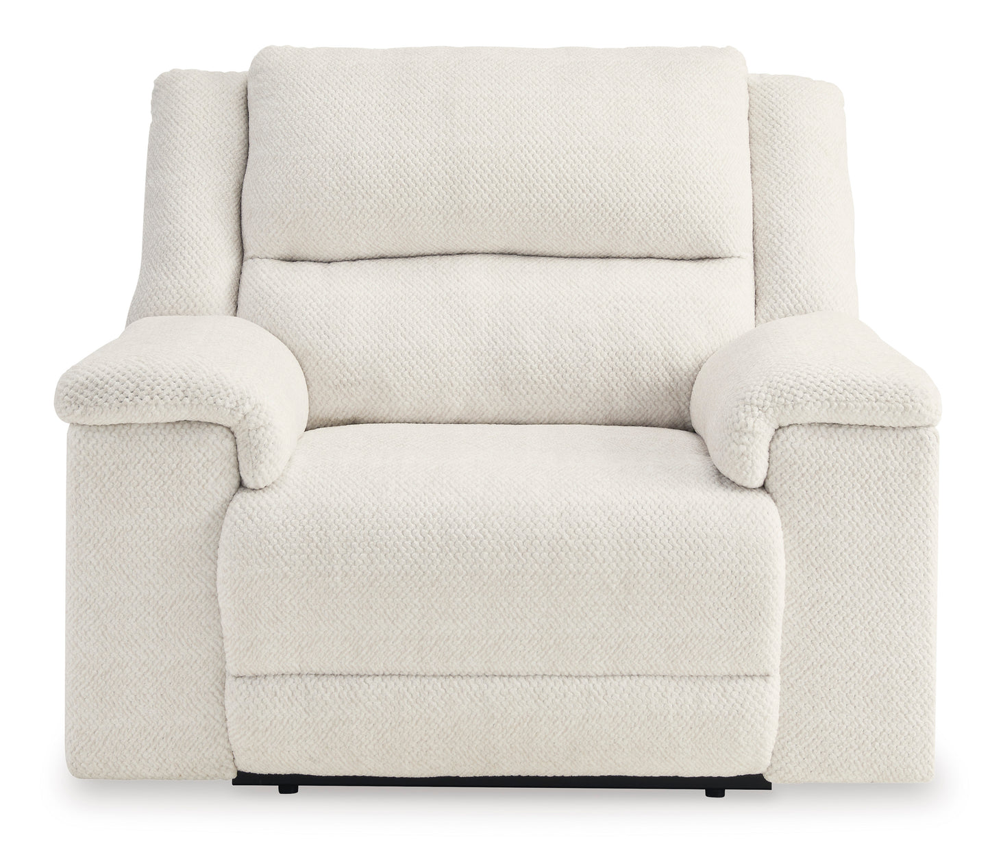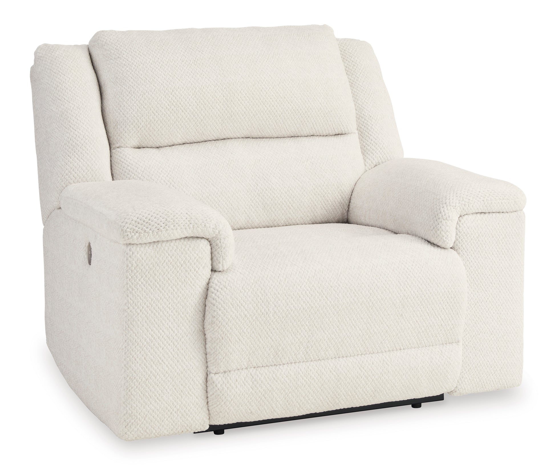 This oversized power recliner seamlessly complements your contemporary cozy space. Bold block arms accentuated with form-fitting padding lend a high-style silhouette. An ample seating area invites you to sprawl during binge watches and relaxed reading hours alike. And with reclining at the press of a button, this piece proves chic design and superb comfort go hand in hand.