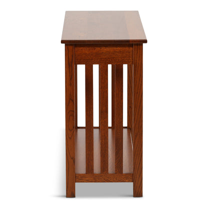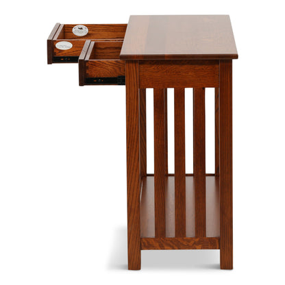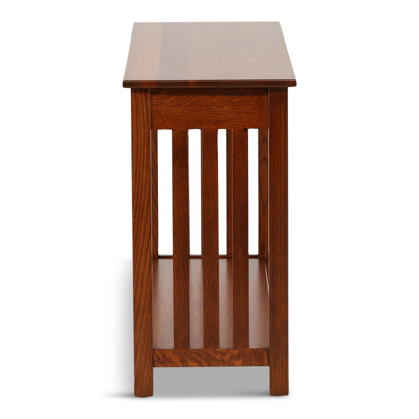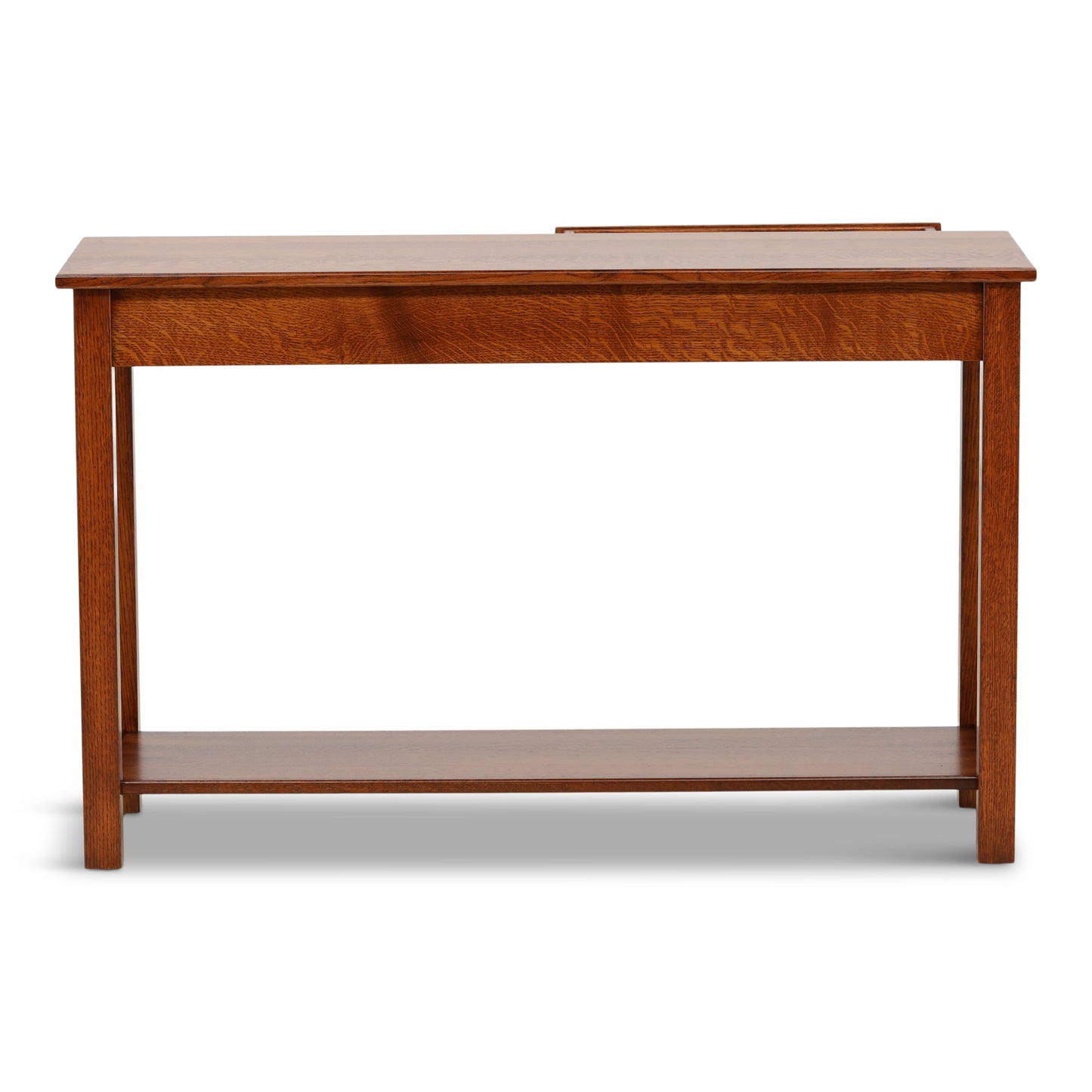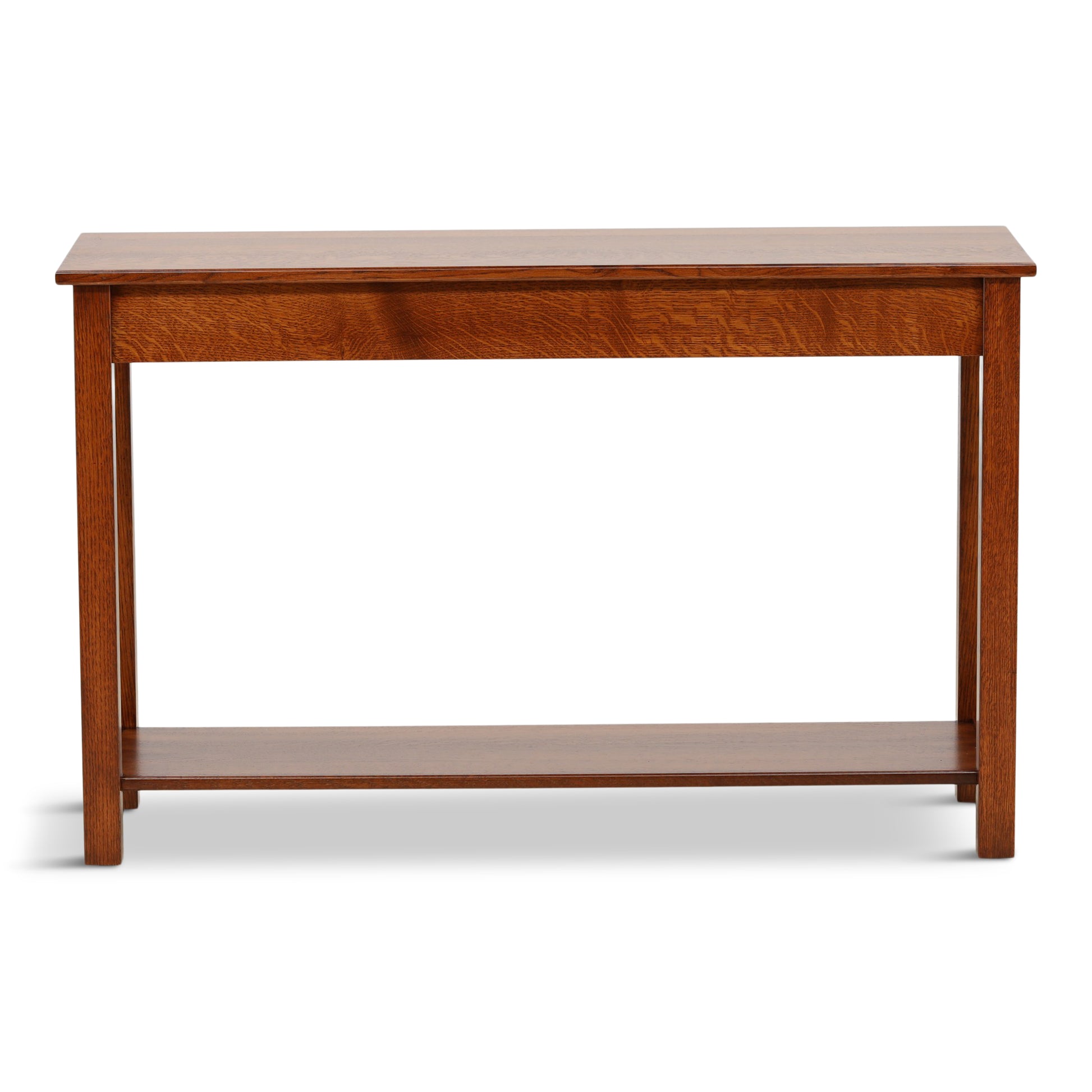 Cherry oak wood looks so good on the Oxford Mission sofa table. This table's design is sure to elevate the aesthetic of any room it is in. A fixed shelf provides display space for your favorite whatnots, while two drawers