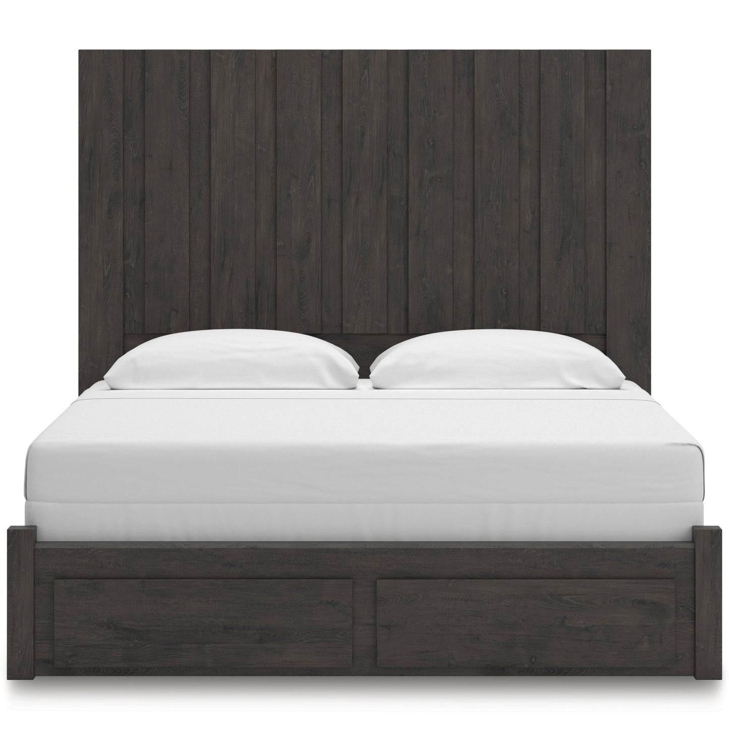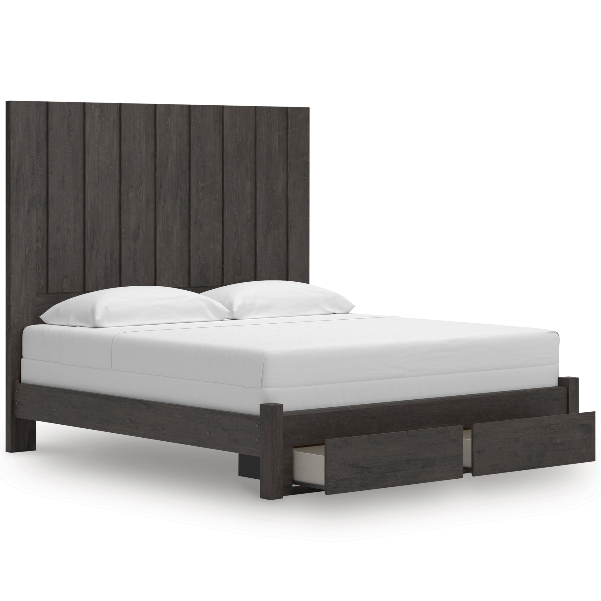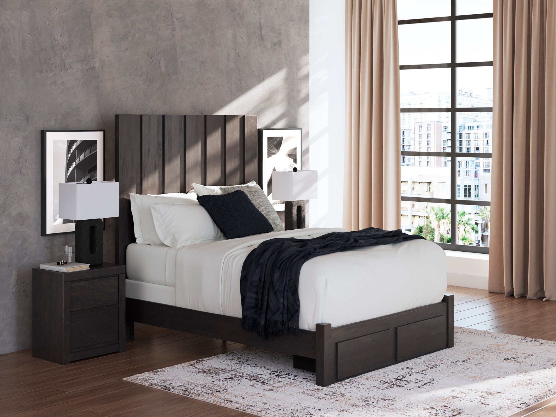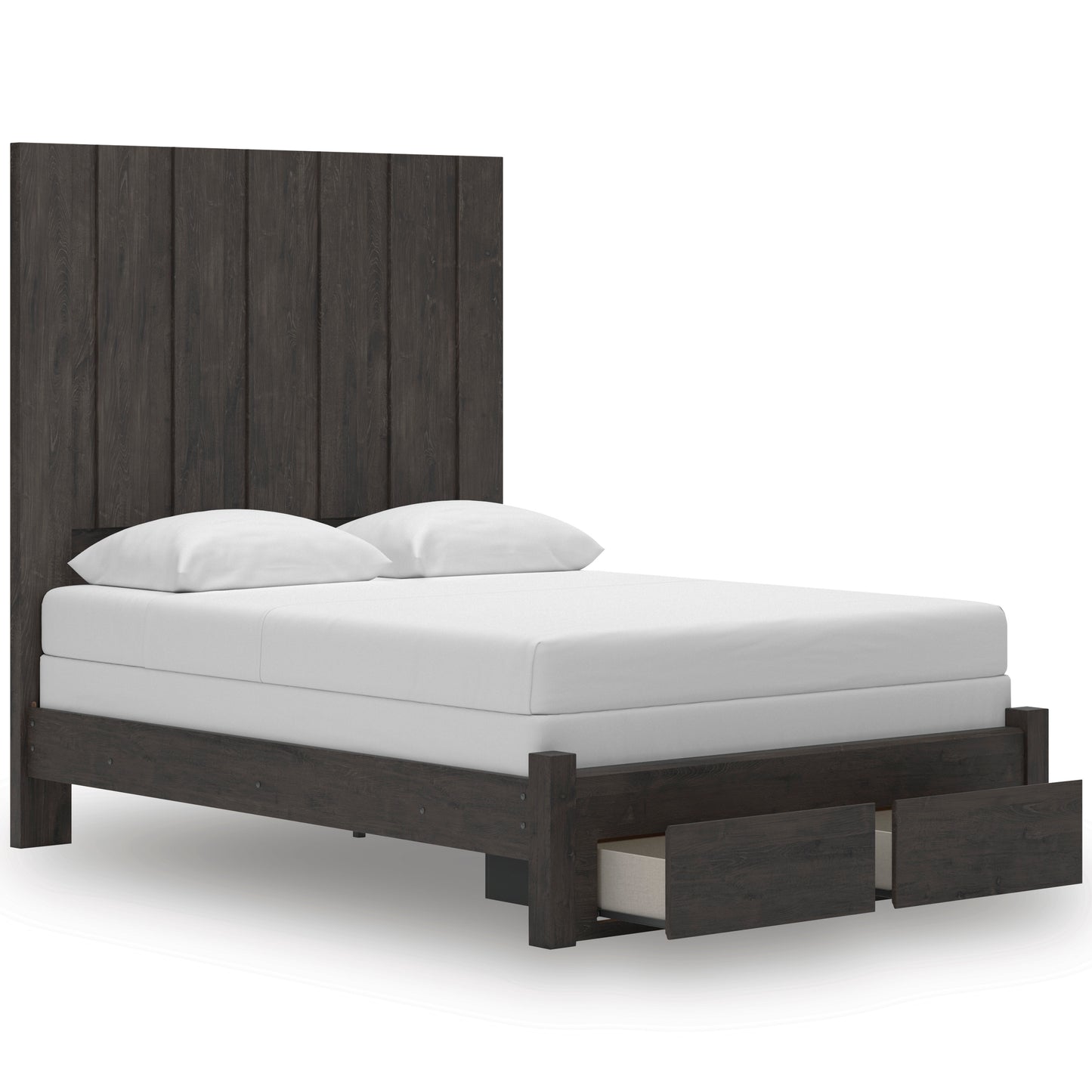 Find serene simplicity in the clean lines and dark neutral tones of this panel storage bed. It’s a sincere approach to modern elegance, giving you high style at a great value. Short on storage? Smooth-gliding drawers in the footboard keep clutter neatly tucked away. Vertical planks decorate the generously scaled headboard to give the illusion of additional height, polishing off the piece in grand fashion.