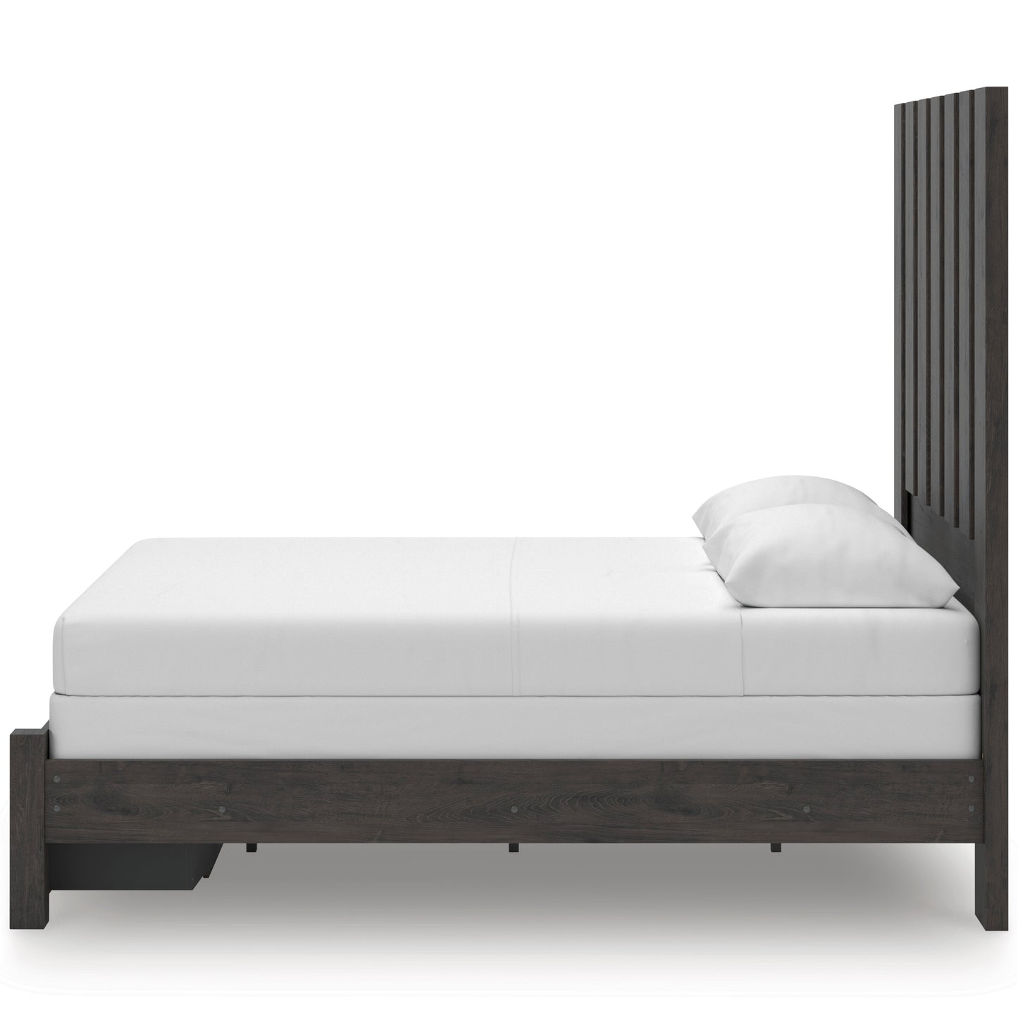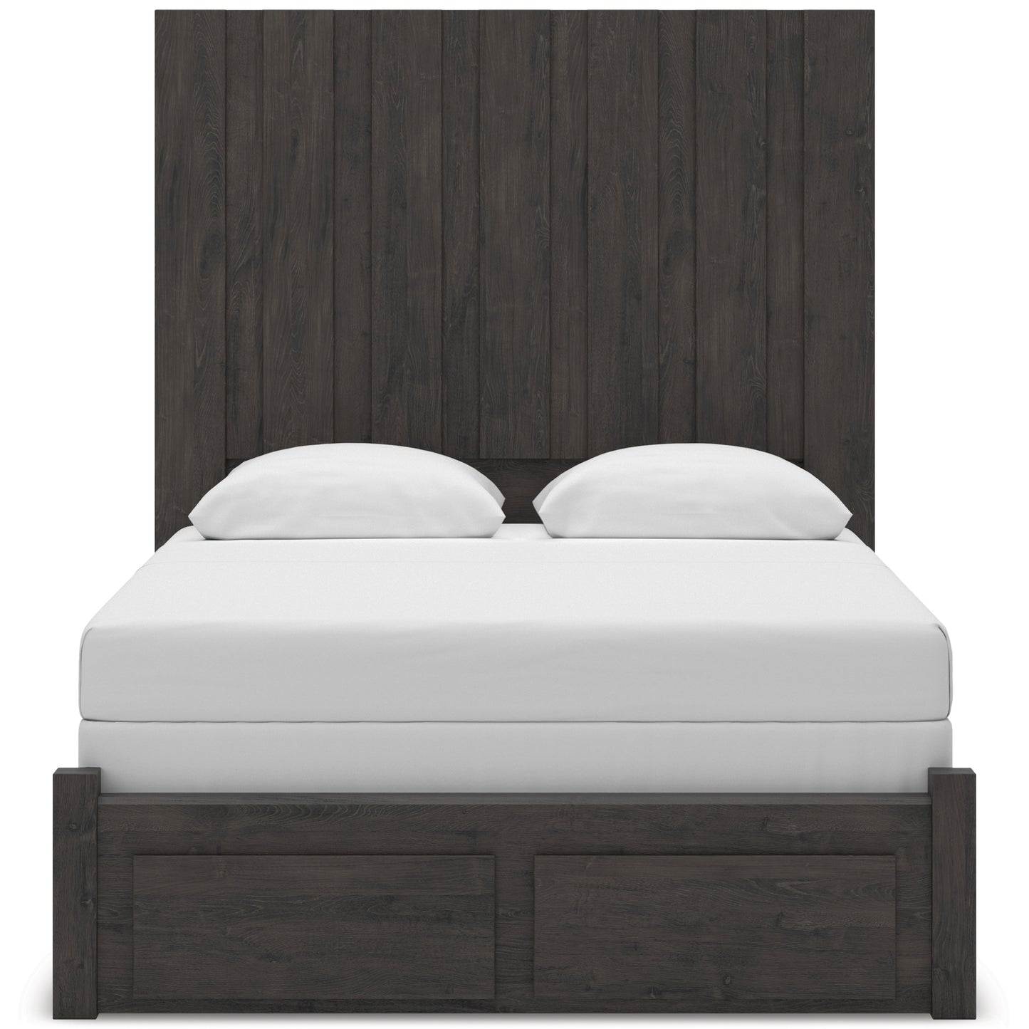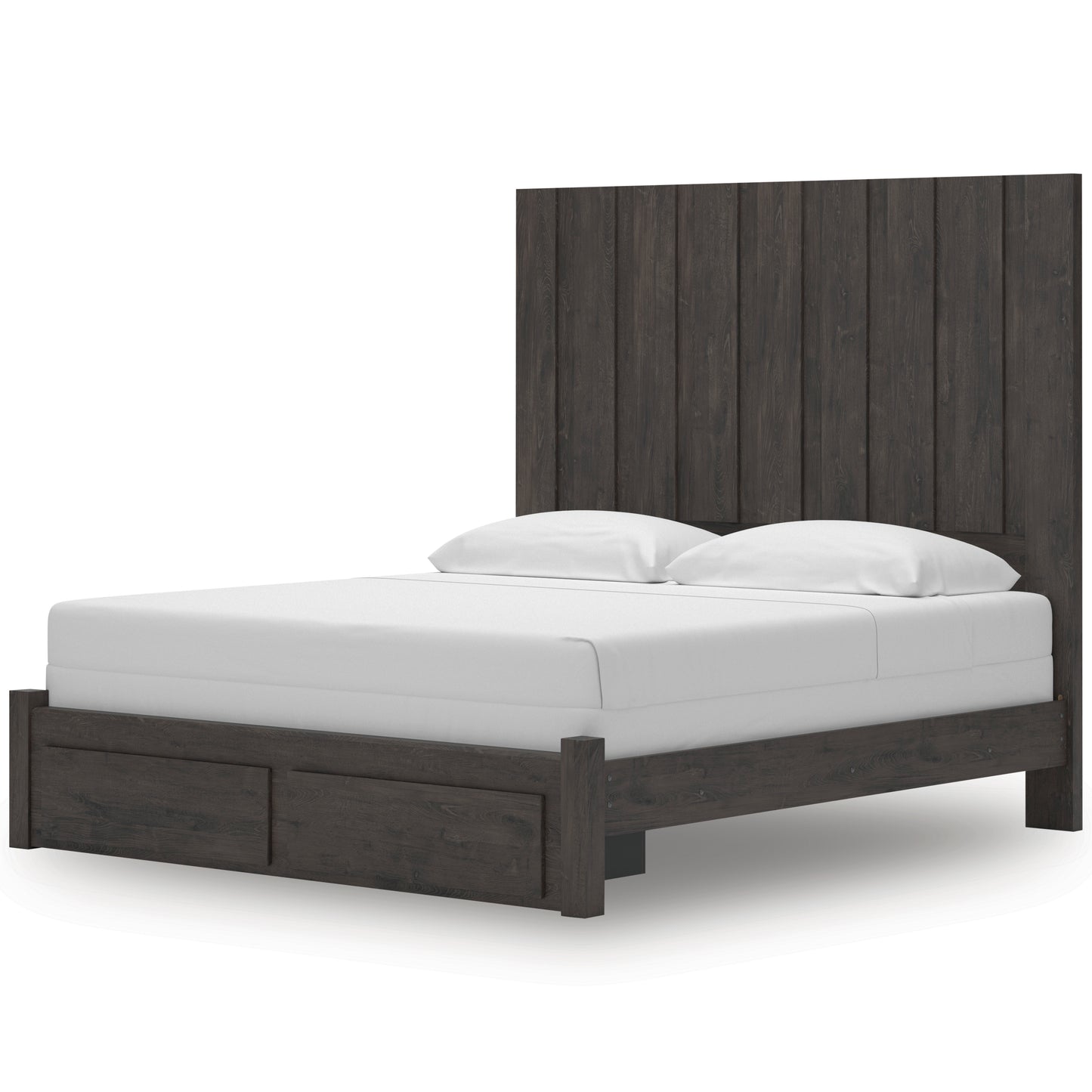 Find serene simplicity in the clean lines and dark neutral tones of this panel storage bed. It’s a sincere approach to modern elegance, giving you high style at a great value. Short on storage? Smooth-gliding drawers in the footboard keep clutter neatly tucked away. Vertical planks decorate the generously scaled headboard to give the illusion of additional height, polishing off the piece in grand fashion.
