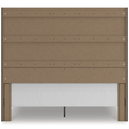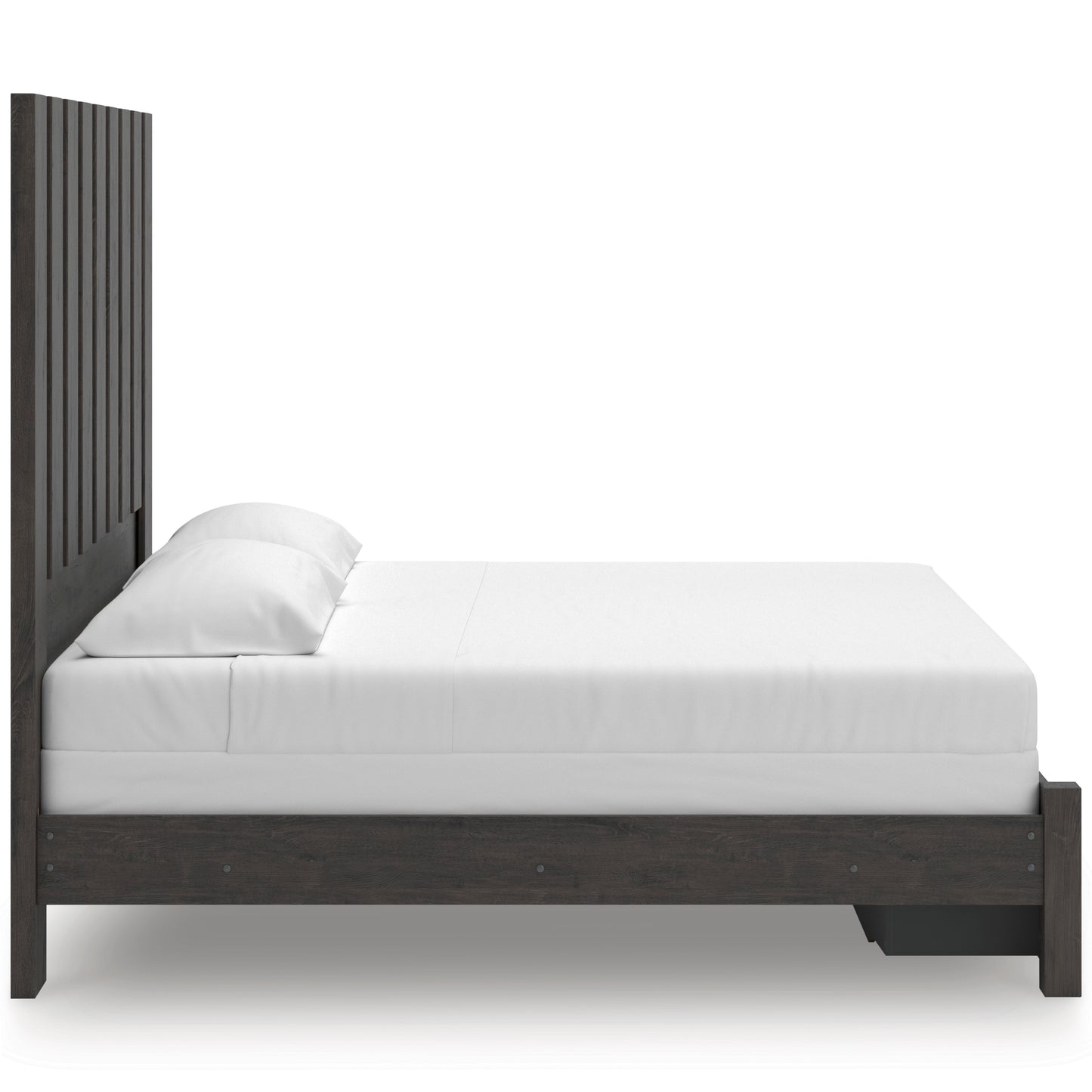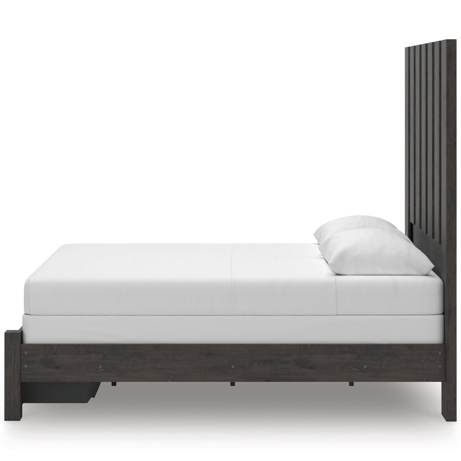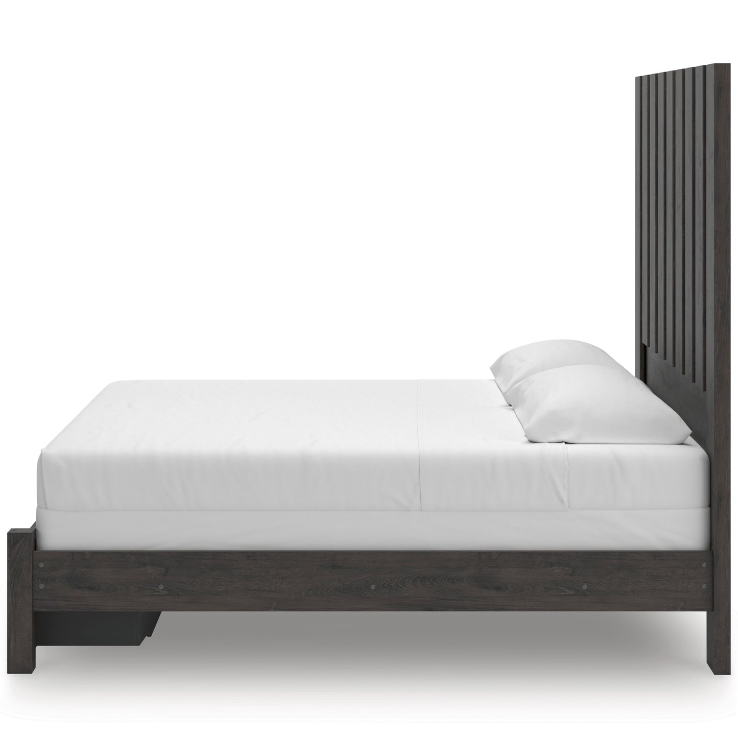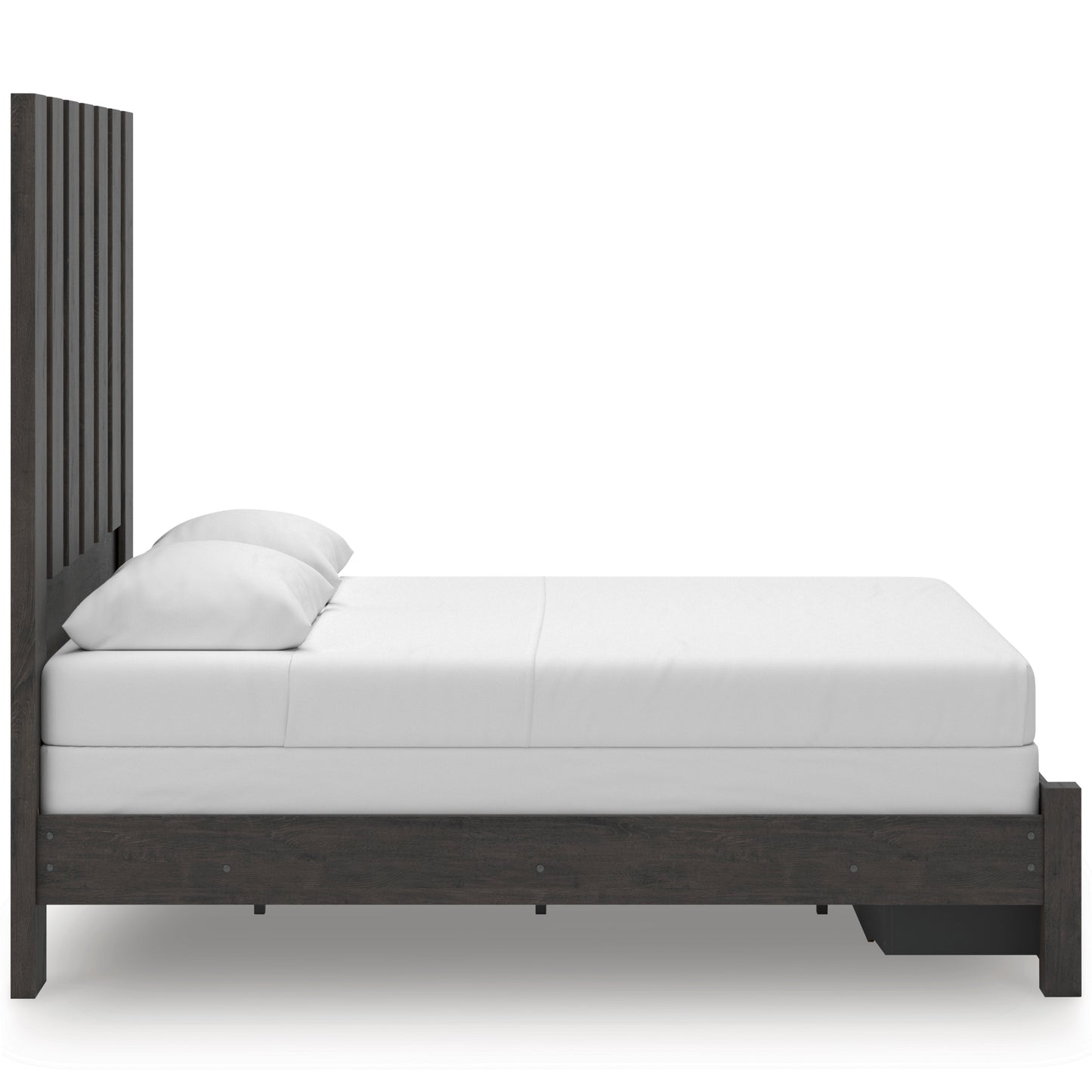 Find serene simplicity in the clean lines and dark neutral tones of this panel storage bed. It’s a sincere approach to modern elegance, giving you high style at a great value. Short on storage? Smooth-gliding drawers in the footboard keep clutter neatly tucked away. Vertical planks decorate the generously scaled headboard to give the illusion of additional height, polishing off the piece in grand fashion.