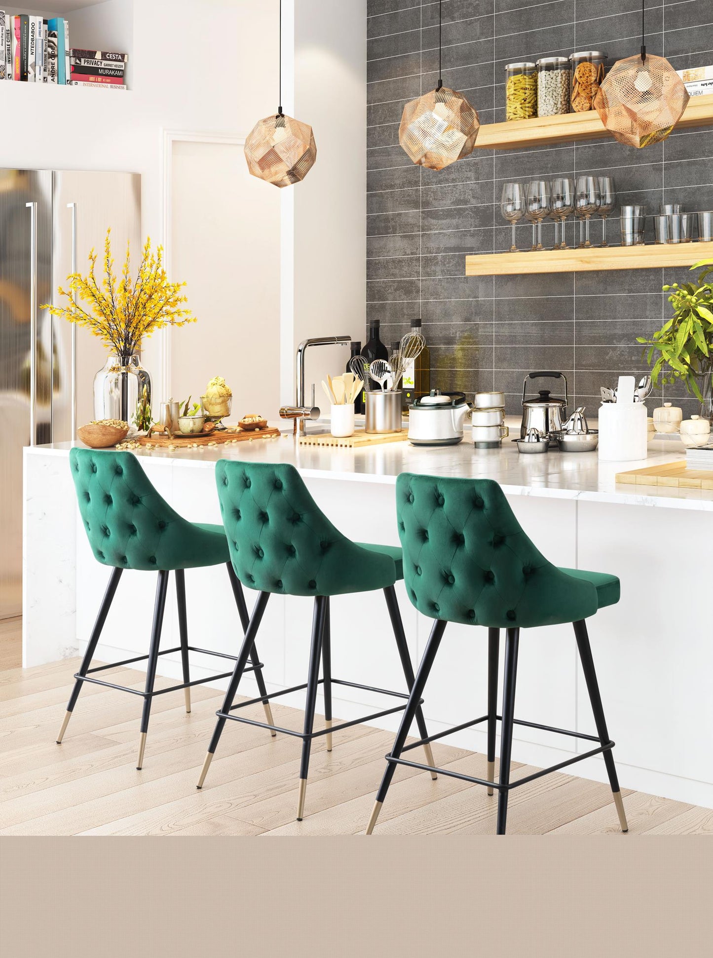 If fashion is your passion, then this counter chair is for you. Make a statement around your kitchen island or counter height table. Its tapered back with button tufting is easy on the eyes and gorgeous from every angle. Support slats provide a comfortable footrest while seated. Slim pencil legs end in brushed brass, giving it an elegant finish.