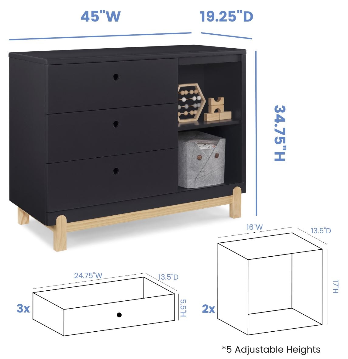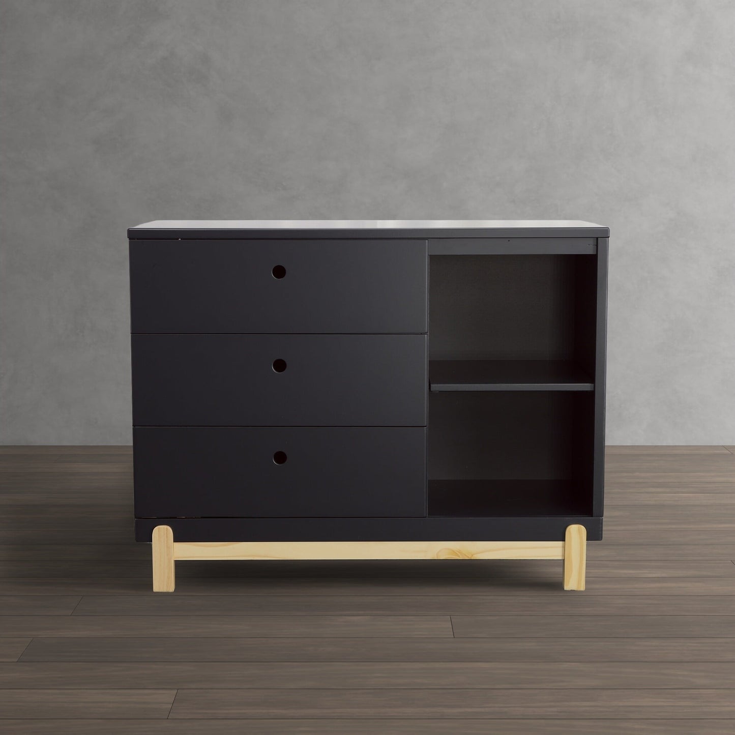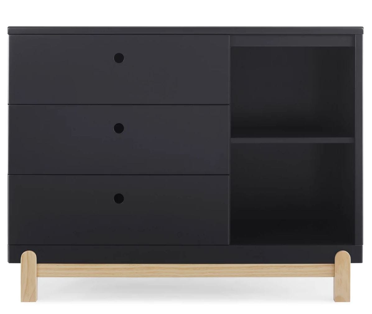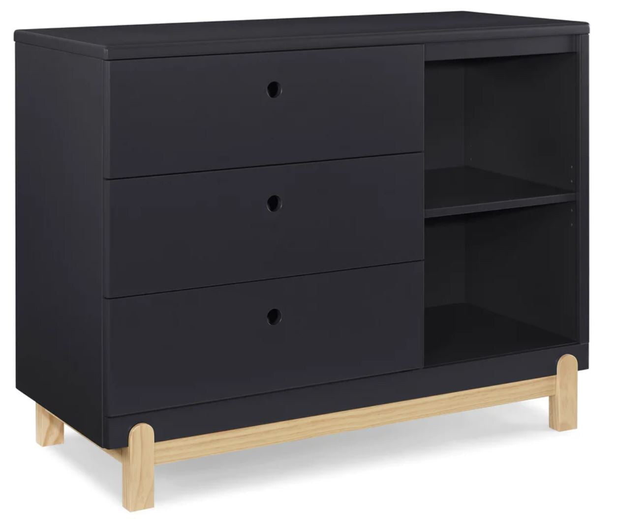 Bring style and convenient storage to your little one's bedroom with the Poppy 3 Drawer Dresser with Cubbies by Delta Children. This wood dresser features three drawers to keep shirts, pants and socks, while the other side features two open cubbies to house books, bins or toys. Modern and playful, this versatile dresser features a natural wood base and feet paired with a contrasting finish on top for a look that works from baby to big-kid. To complete your child’s bedroom, pair the Poppy 3 Drawer Dresser with Cubbies with the Poppy 4-in-1 Convertible Crib by Delta Children. Dresser is available in Bianca White with Natural, Grey with Natural and Midnight Grey with Natural.