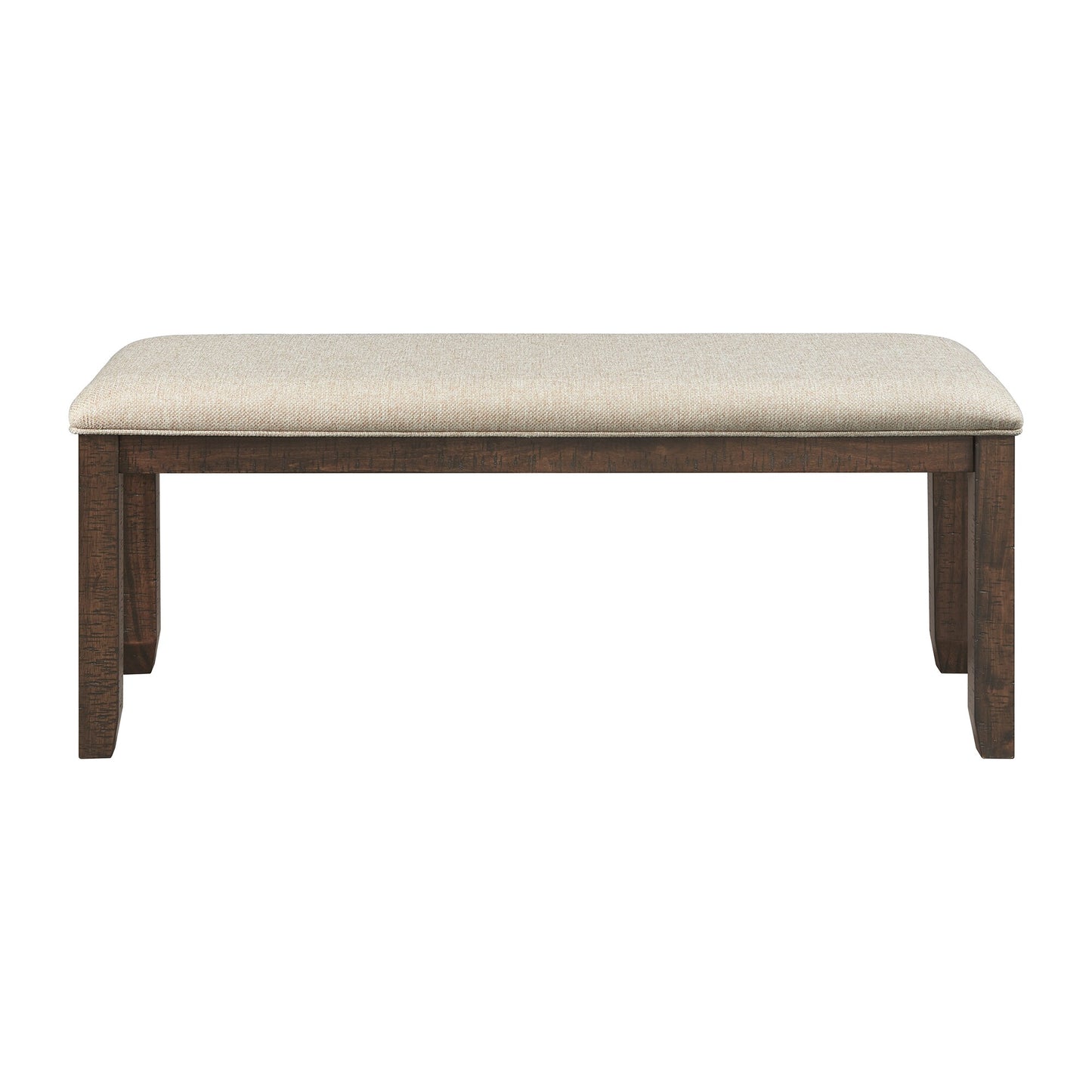 The Portland dining collection makes rustic entertaining easy. Its smokey cherry finish and earthy wood grain detail create an organic look. Flared legs, turnbuckle metal accents, and upholstered seating add a contemporary flavor to this charming set.