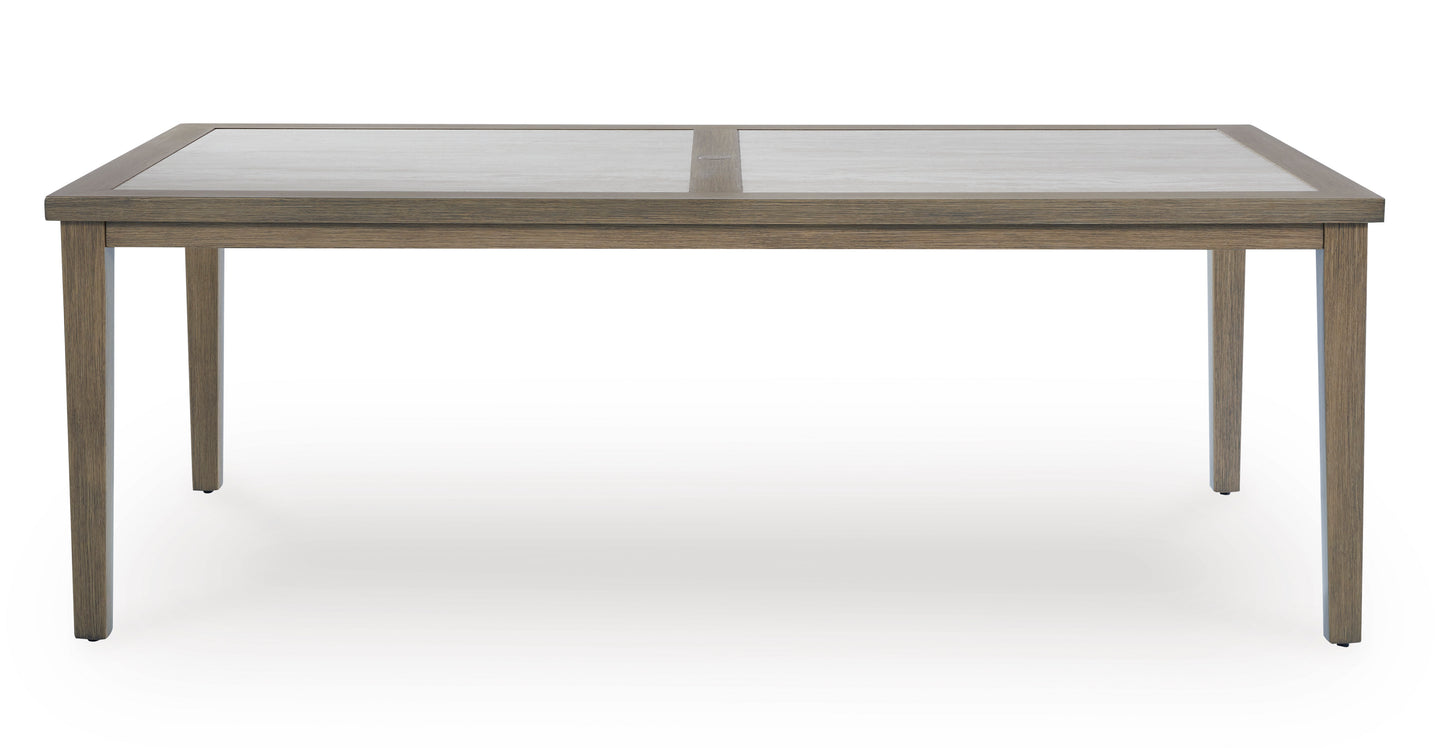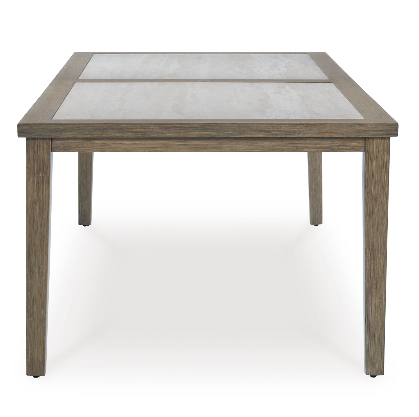 Experience the perfect combination of durability and style with this outdoor dining table. An aluminum frame with a wood-look finish maintains a sleek, contemporary aesthetic, while the sintered stone tabletop adds an element of natural elegance. This delightful addition to your outdoor dining creates an oasis where comfort and beauty thrive.