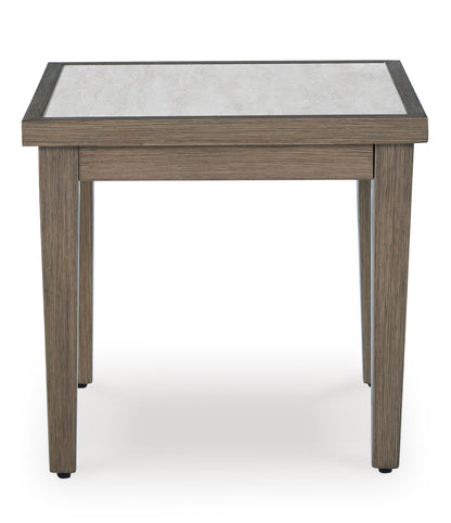Experience the perfect combination of durability and style with this outdoor end table. An aluminum frame with a wood-look finish maintains a sleek, contemporary aesthetic, while the sintered stone tabletop adds an element of natural elegance. This delightful companion to your outdoor seating creates an oasis where comfort and beauty thrive.