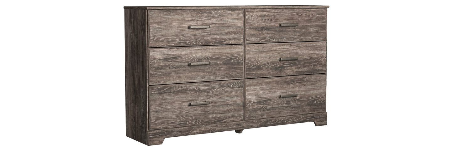 With its clean-lined look and modern attitude, the Ralinksi dresser is a fresh style awakening. Warm gray hue over replicated oak grain easily complements other furniture finishes. Smooth drawer fronts with antiqued pewter-tone handles completes the aesthetic.