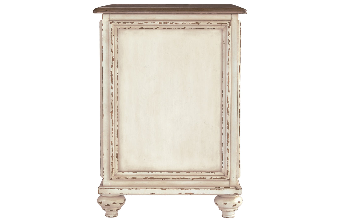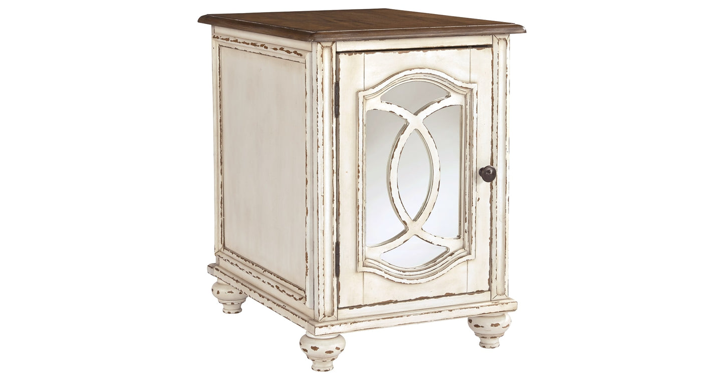 Elevating the art of traditional cottage styling, the Realyn chairside end table is sure to serve you beautifully for years to come. Antiqued two-tone aesthetic blends a chipped white with a distressed wood finished top for added charm. Cabinet door features inset mirror with filigree moulding for a fanciful twist.