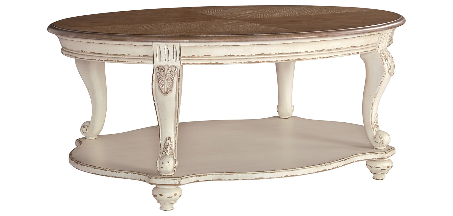 Elevating the art of traditional cottage styling, this oval coffee table is sure to serve you beautifully for years to come. Antiqued two-tone aesthetic blends a chipped white with a distressed wood finished top for added charm. Classic cabriole legs and shapely lower shelf are a lovely twist. Decorative corbels add refinement.