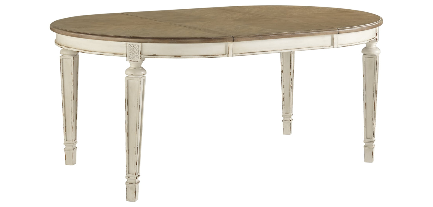 Bon appétit. This dining room extension table has all the right ingredients for a French country-inspired feast for the eyes. Drop-in leaf allows you to transform an intimate round dining table into a gracious oval dining table that comfortably seats six. Antiqued two-tone aesthetic pairs a chipped white with a distressed wood finished top for a double serving of charm.