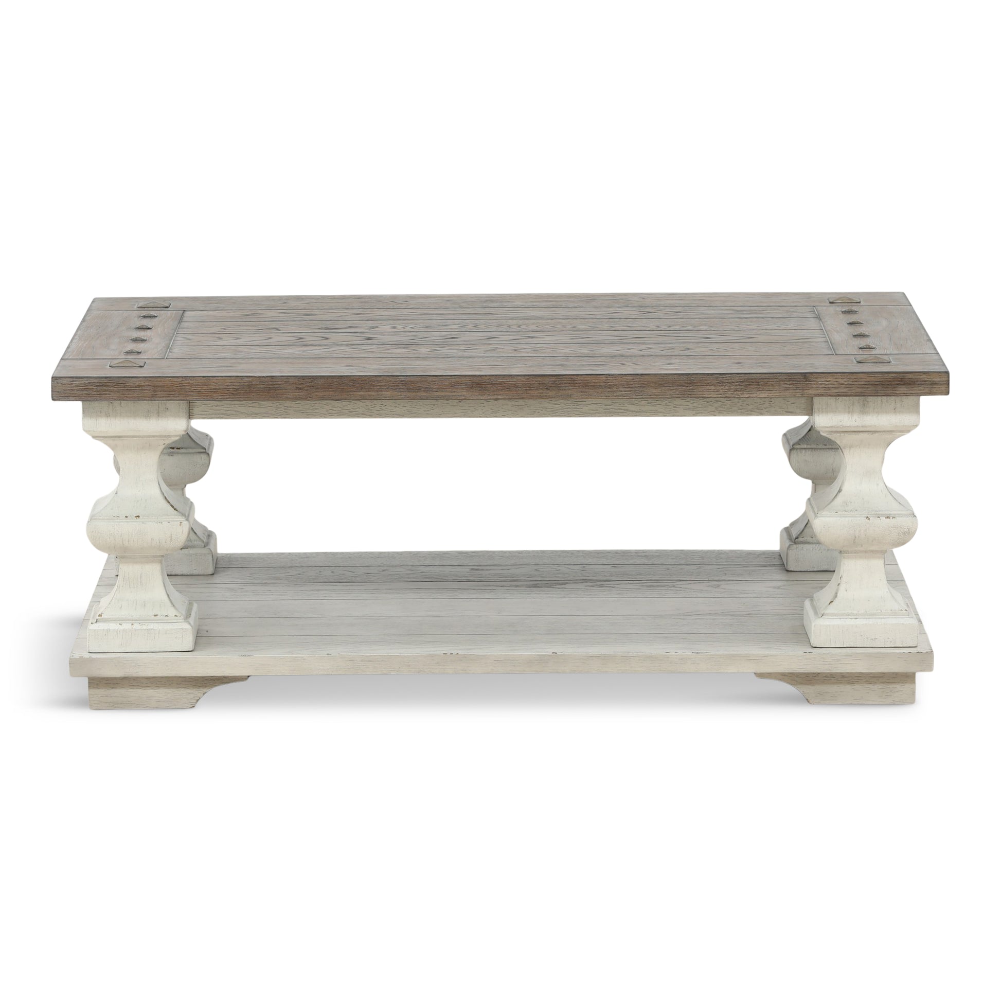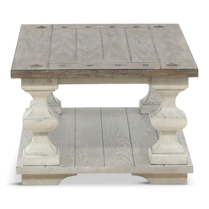 This collection features Spanish style turned legs with a heavy planked top and square peg accents. Bottom shelves for storage and display are featured for each table. This collection is perfect for leather upholstery.