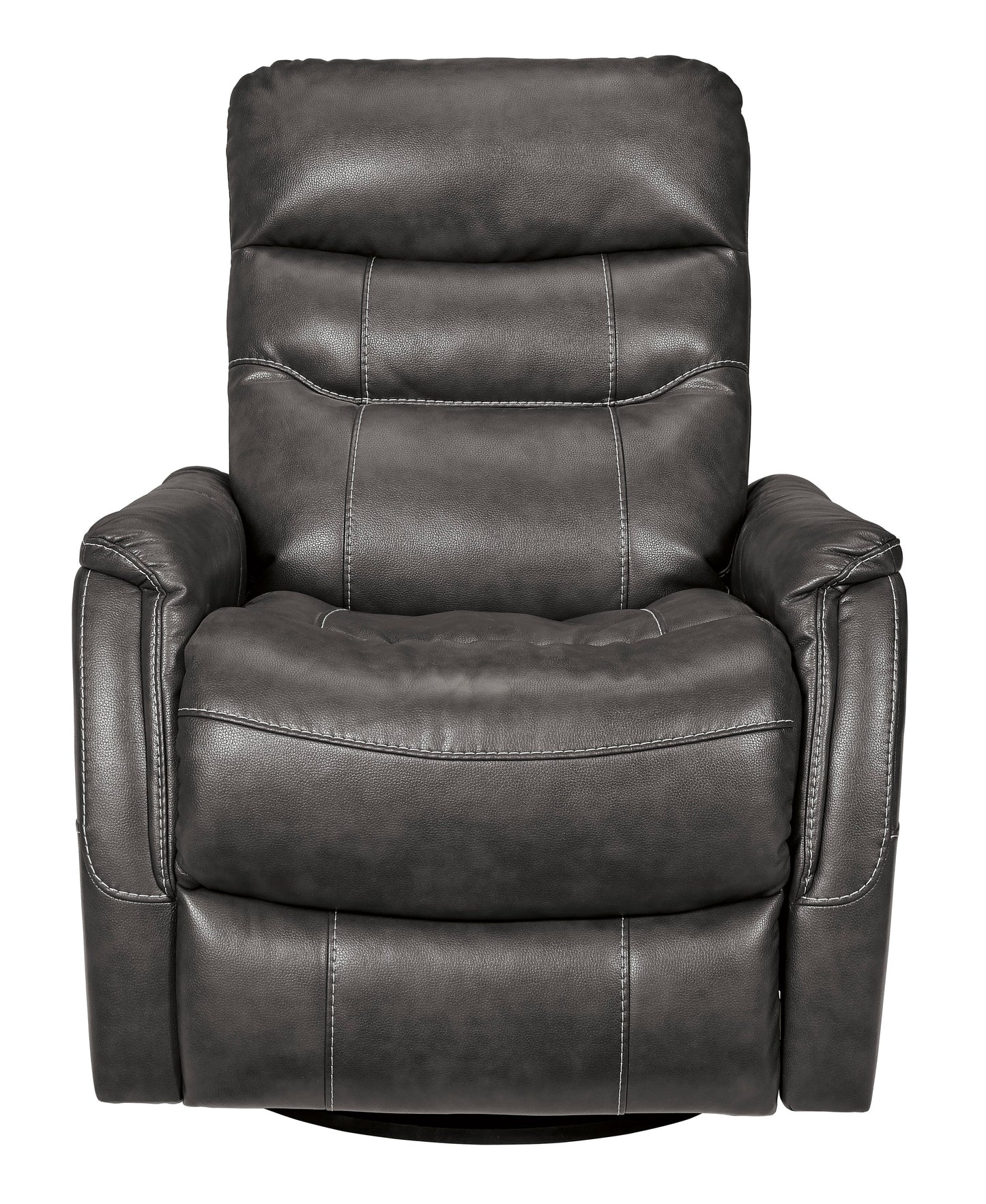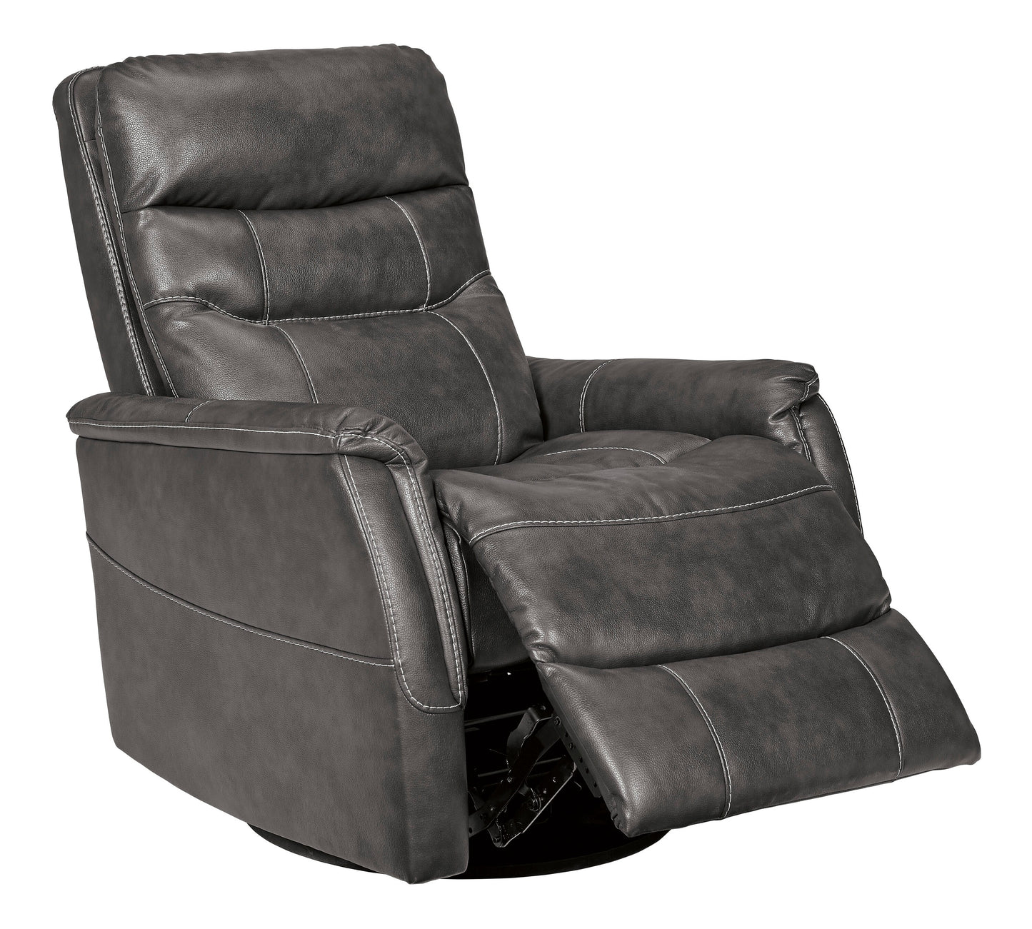 If you agree it’s high time for better form and function from your furniture, the Riptyme swivel glider recliner with gentle rocking motion might be just your style. Indulgently comfortable yet anything but bulky, its space-conscious design pairs slimmed-down armrests with a roomy seating zone for maximum comfort. Rest assured, the sumptuously cushioned 41" high back is head and shoulders above the rest. Thanks to an EZ Pull tucked discreetly inside the armrest, while this faux leather chair may be a recliner, it sure doesn’t look like one.