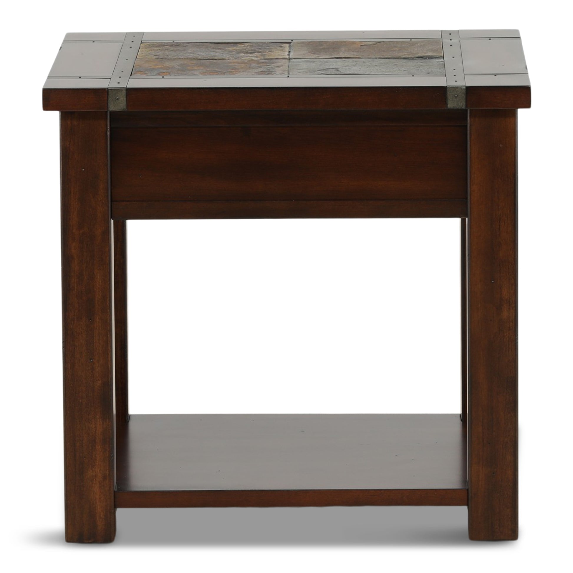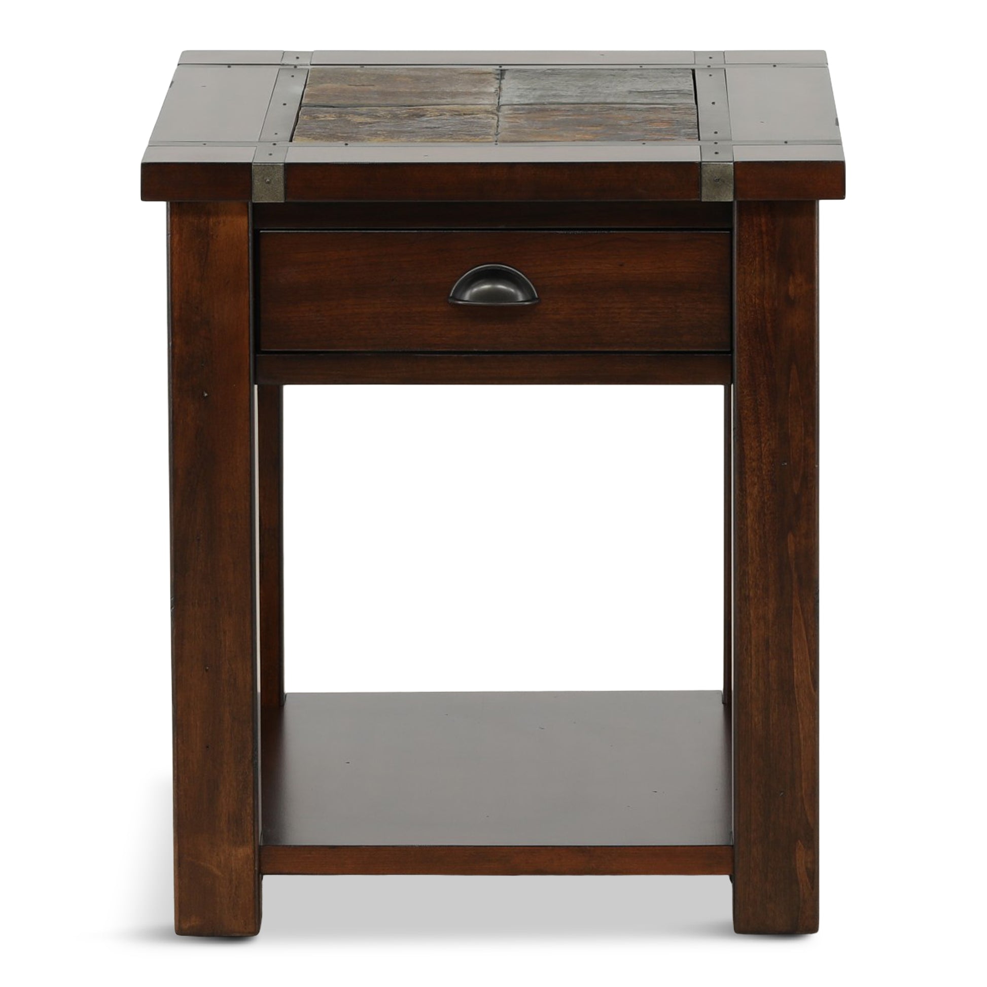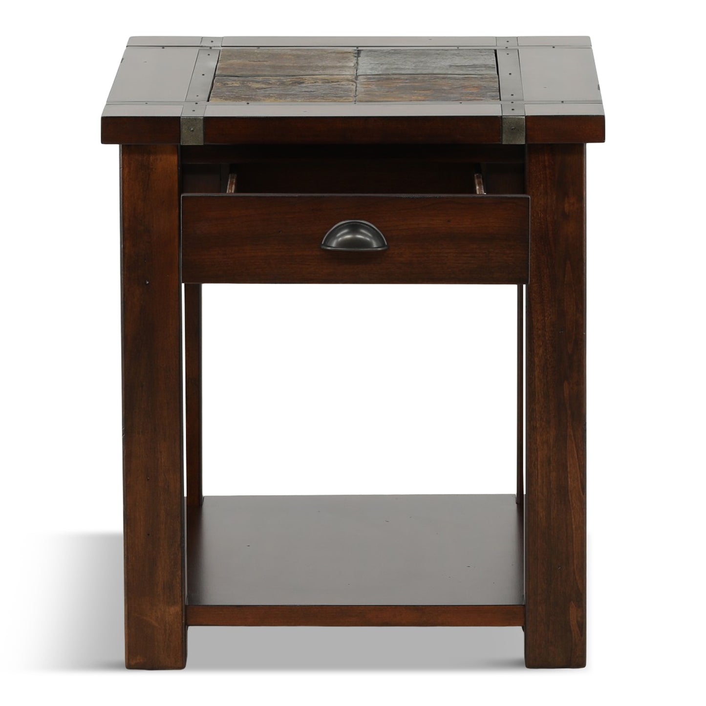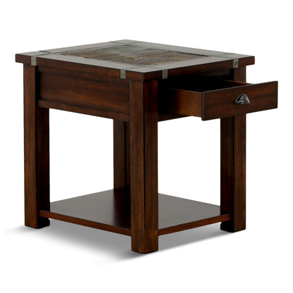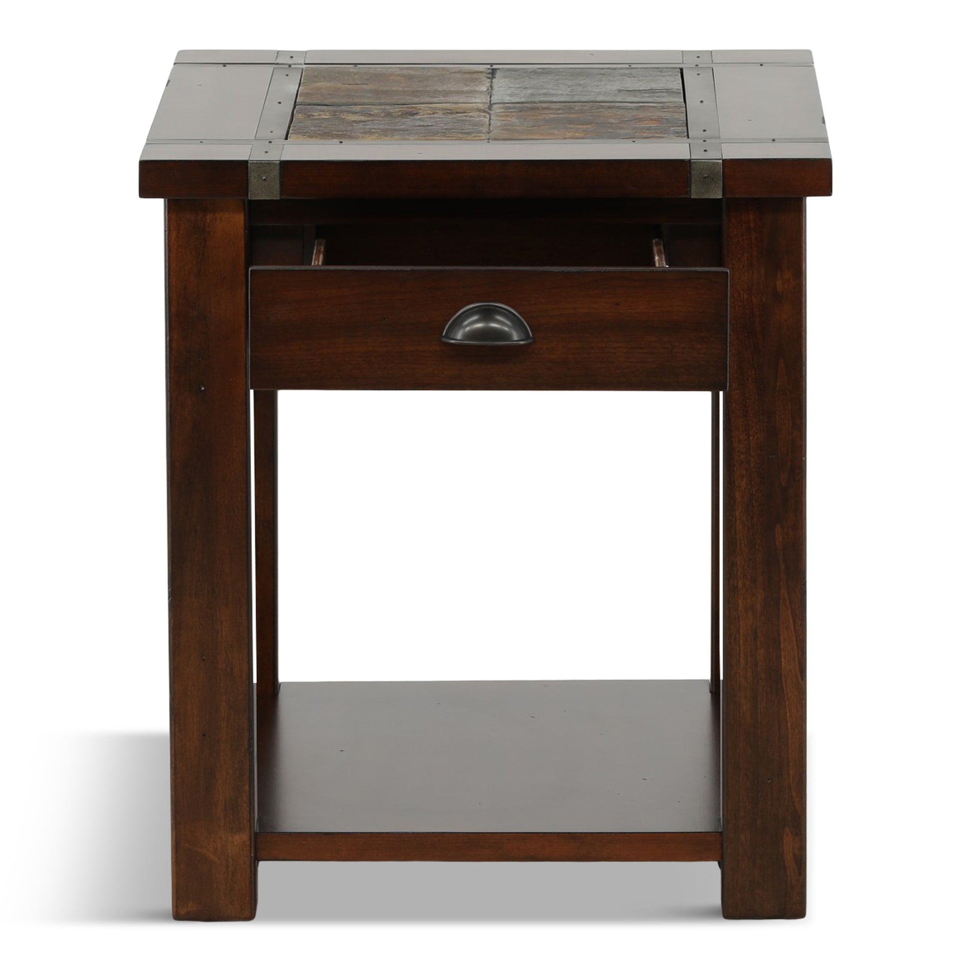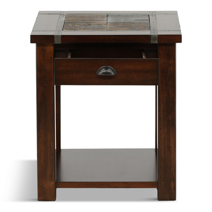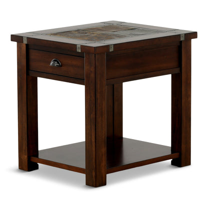 A handsome wood design accented with pewter strapping, the Roanoke end table brings rustic charm and added storage space to your home. Set your drink down on the durable and attractive slate inlay and conveniently tuck remotes and clutter in the sliding drawer.
